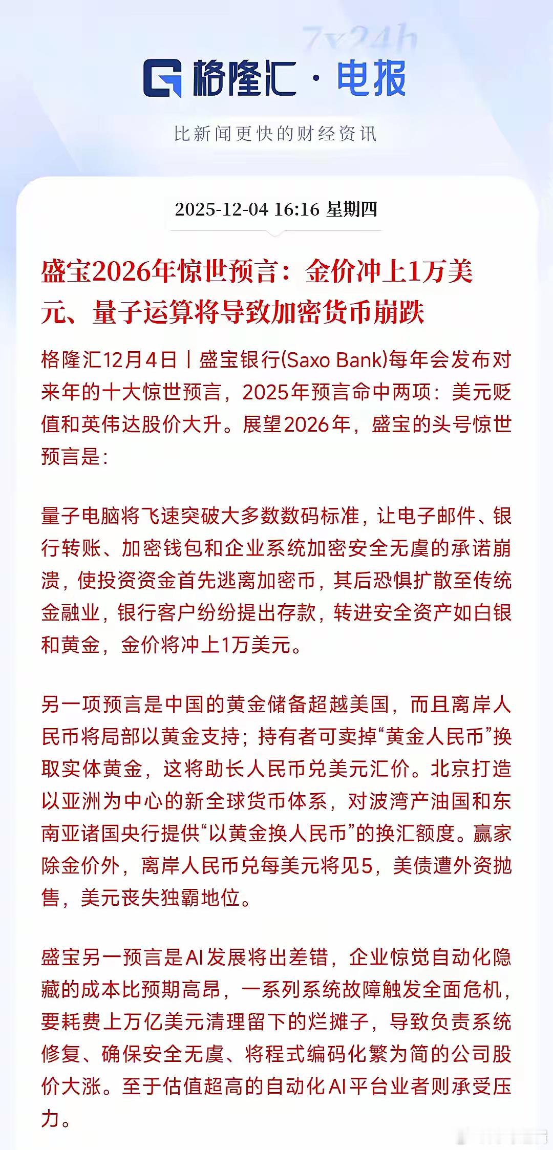 惊世预言又来了,2025年的预言全部验证盛世银行可以说是经济领域的专职预言家关键是还非常的准。2025年的两大预言全部成真:1.英伟达股价将大涨,目前到现在英伟达涨了33.76%。2.美元贬值,而美元指数今年下跌了8.9%。2026年新的预言又来了1.虚拟货币将暴跌,会传导到金融业,致使热钱全部冲到黄金里面避险,黄金的价格会站上1万美元。2.中国的黄金储备将会超过美国。美元兑人民币将破5,人民币疯狂升值,美元霸主地位将会受到威胁。以上两个预言预示着:1.以目前黄金的价格算,黄金还将上涨140%。2.人民币将会升值41.47%,这将是一个非常大的升值。