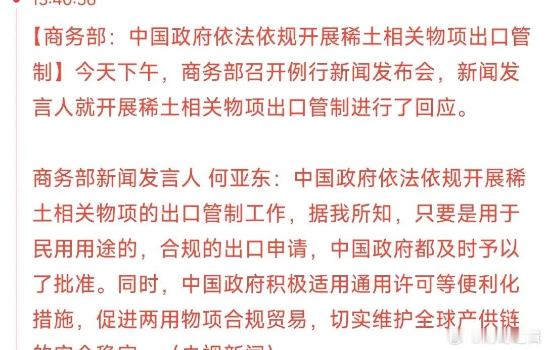 稀土该反弹一波了,依法依规出口管制稀土是军民两用的关键材料,既能造新能源汽车,也能用于先进战机、核潜艇等尖端武器。管制要求出口得先申请许可,防止它被拿去用于危害中国安全或破坏国际和平的活动。中国已经对国外的汽车企业放松了管制,像宝马,通用等企业都已经拿到了够用的稀土。这里说的管制基本上都是对于军事上面说的,制造杀伤性武器的。稀土一直是稀缺资源,中国已经有了稀土的定价权,未来肯定还会涨价的,毕竟这东西用一点少一点。