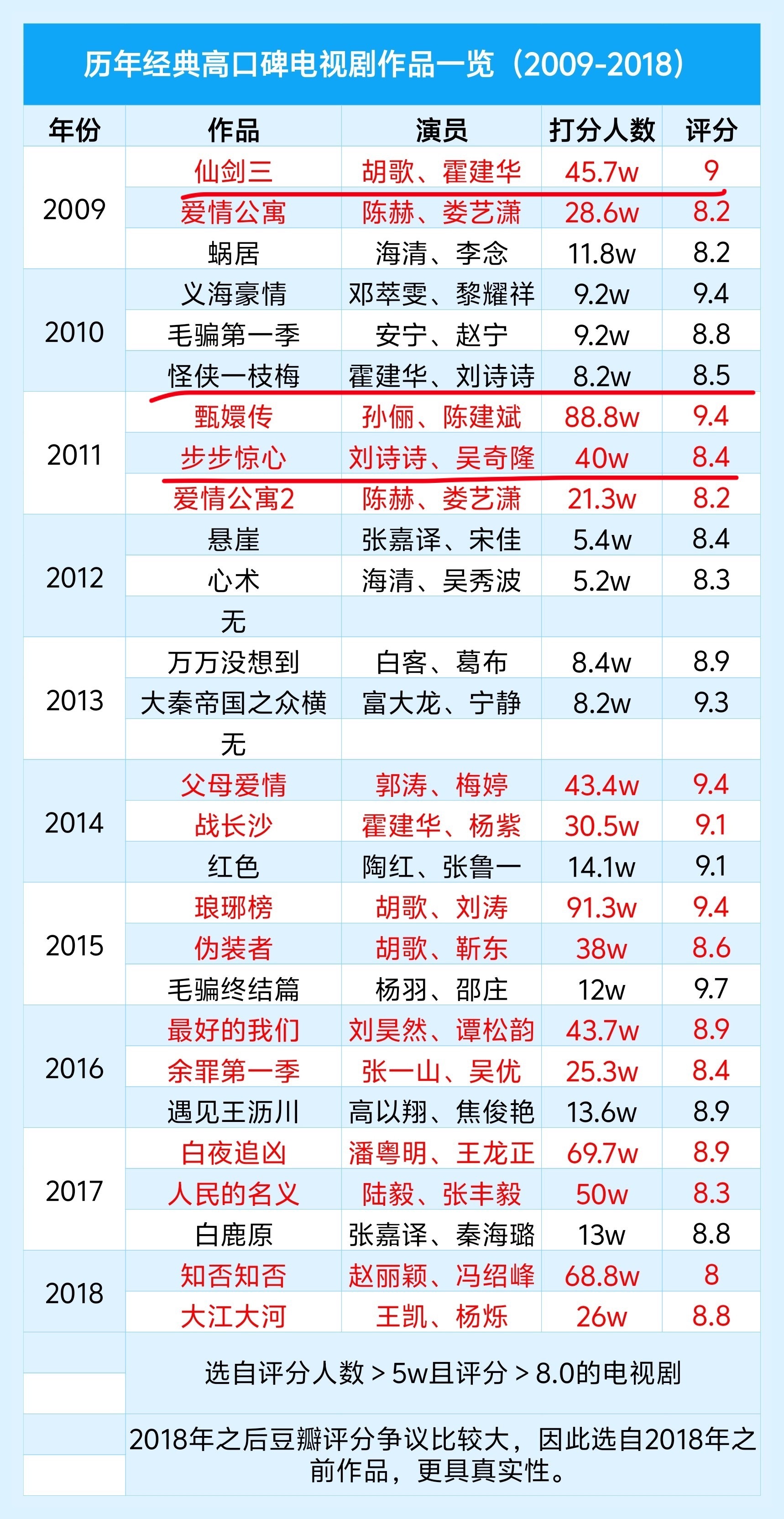 历年经典高口碑电视剧作品一览(2009-2018)刘诗诗一人占三部:《步步惊心》《怪侠一枝梅》《仙剑三》