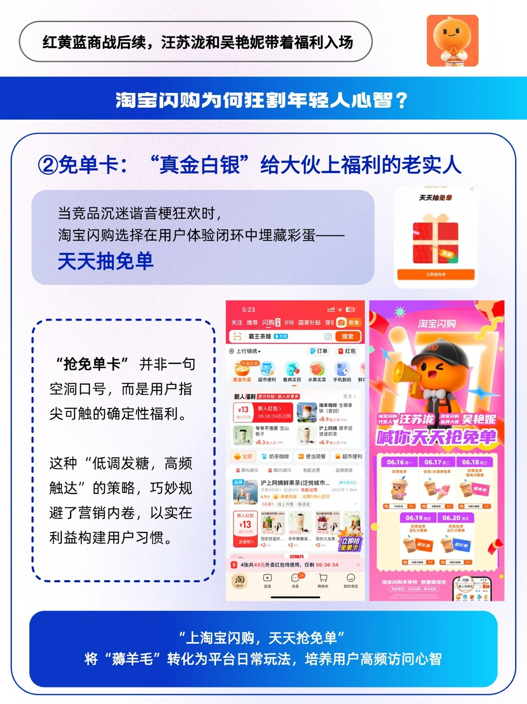 淘宝闪购精准定位“多”与“快”的核心优势,以“天天抢免单”的玩法互动,将“薅羊毛”转化为平台日常玩法,培养用户高频访问心智🫡