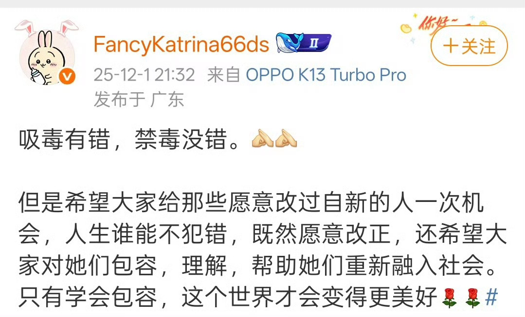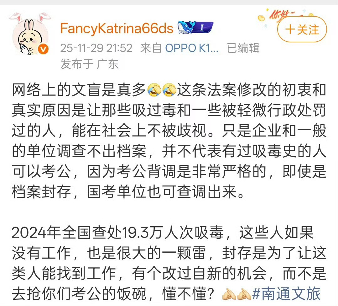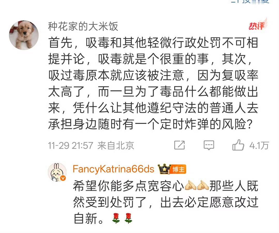 这位希望对吸毒者多点宽容心,吸毒者受到了处罚,出去必定愿意改过自新……