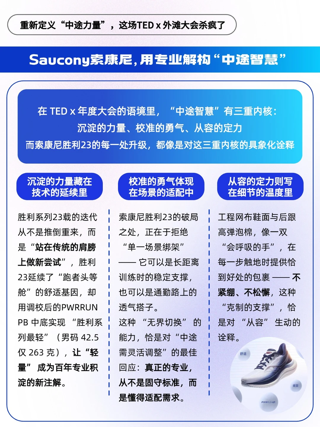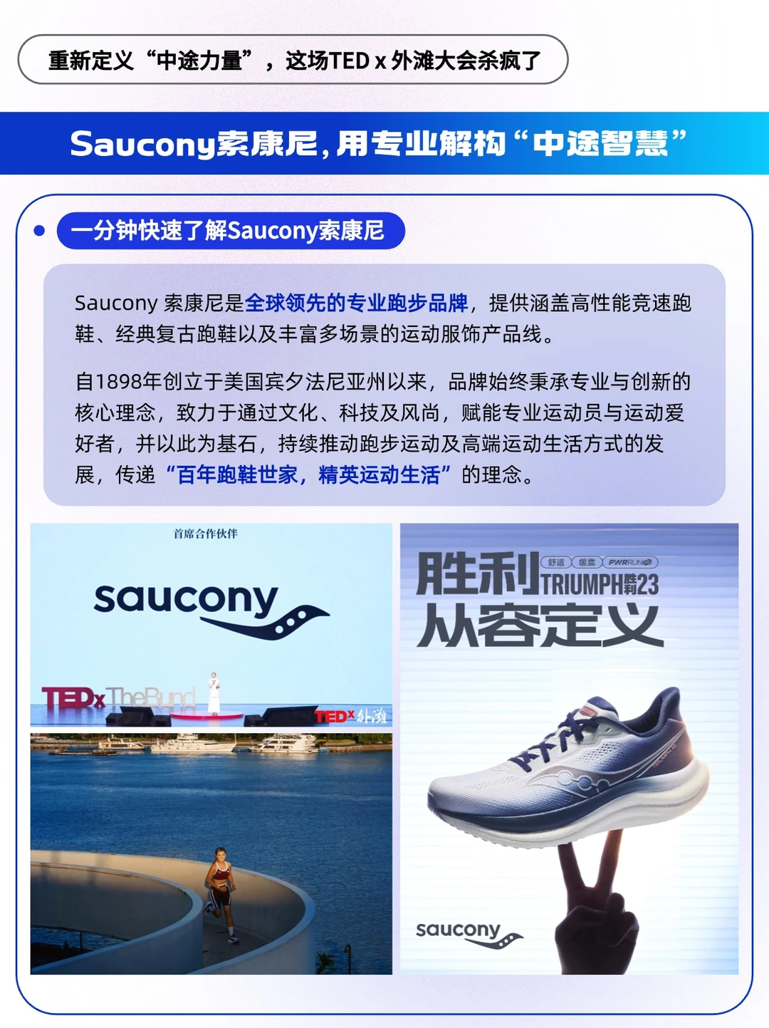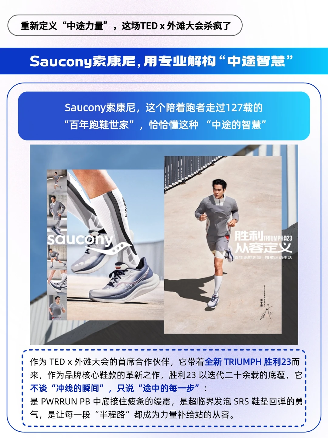 🔵作为TEDx 外滩年度大会的首席合作伙伴,它带着全新 TRIUMPH胜利23而来,不谈“冲线的瞬间”,只说“途中的每一步”。Saucony 索康尼把这份思考缝进了每一寸设计里 —— 中底体积 10% 的增量,是给 “沉淀” 留的余地;263 克的轻量化,是为 “调整” 减的负担;从初代到 23 代的迭代,是用百年专业证明:胜利从不是终点站的烟花,而是途中每一步都踩在自己节奏上的笃定。