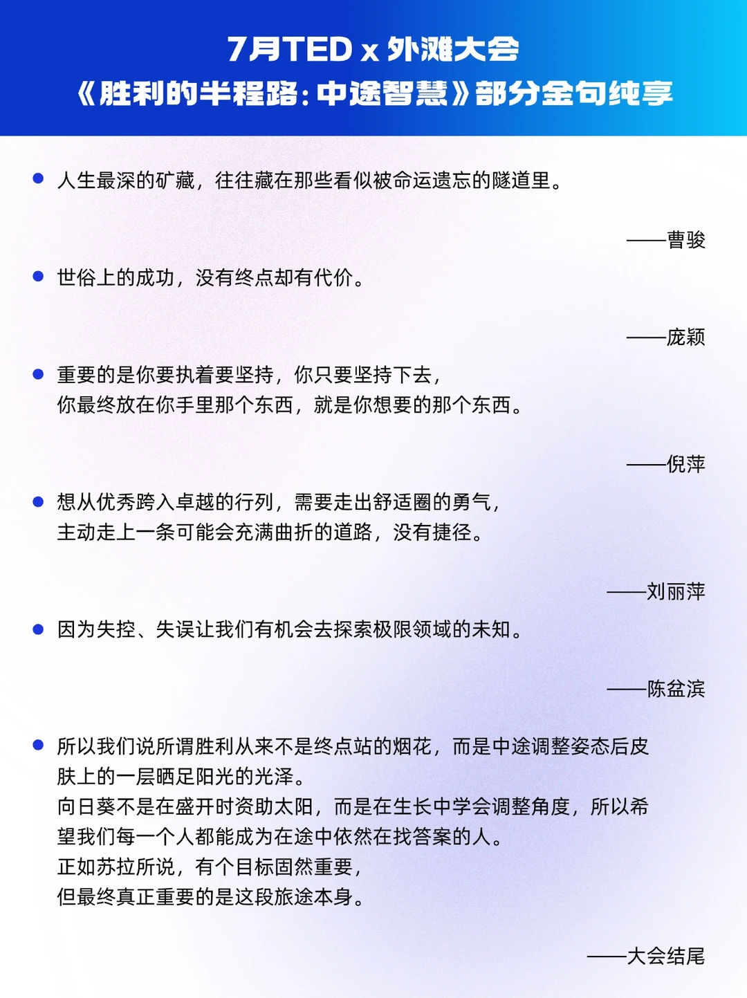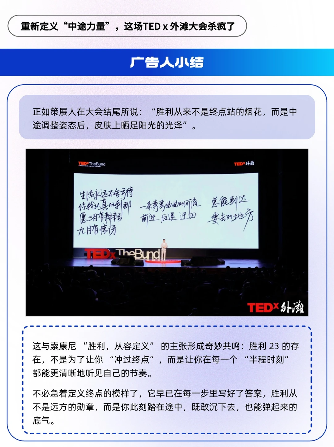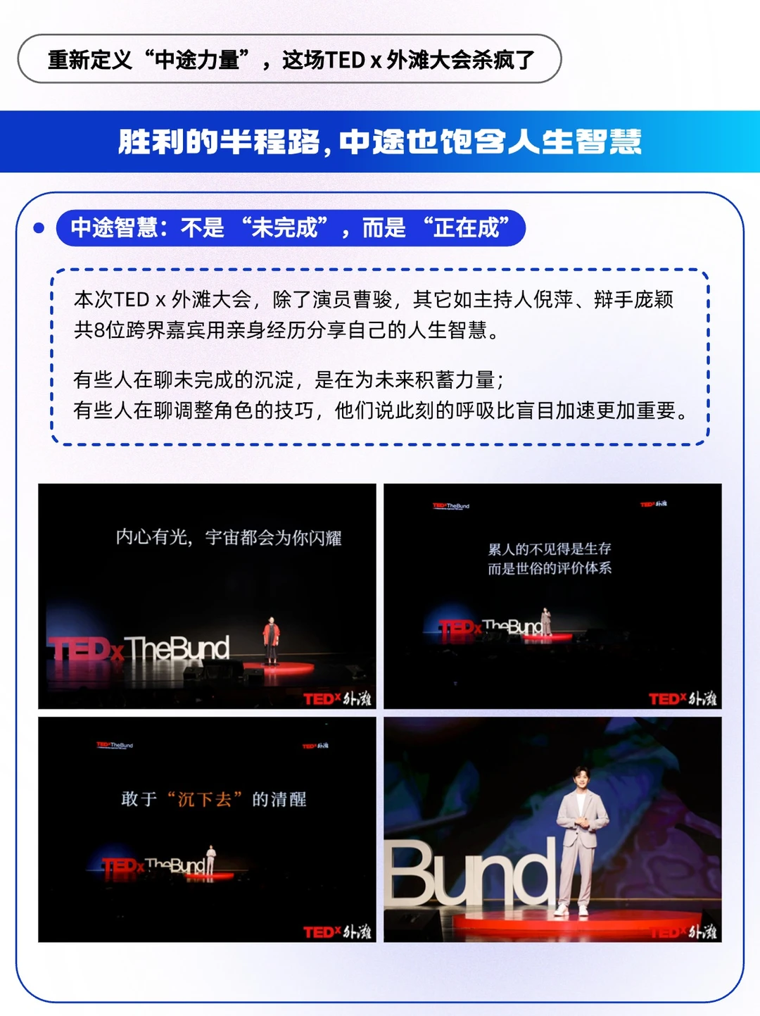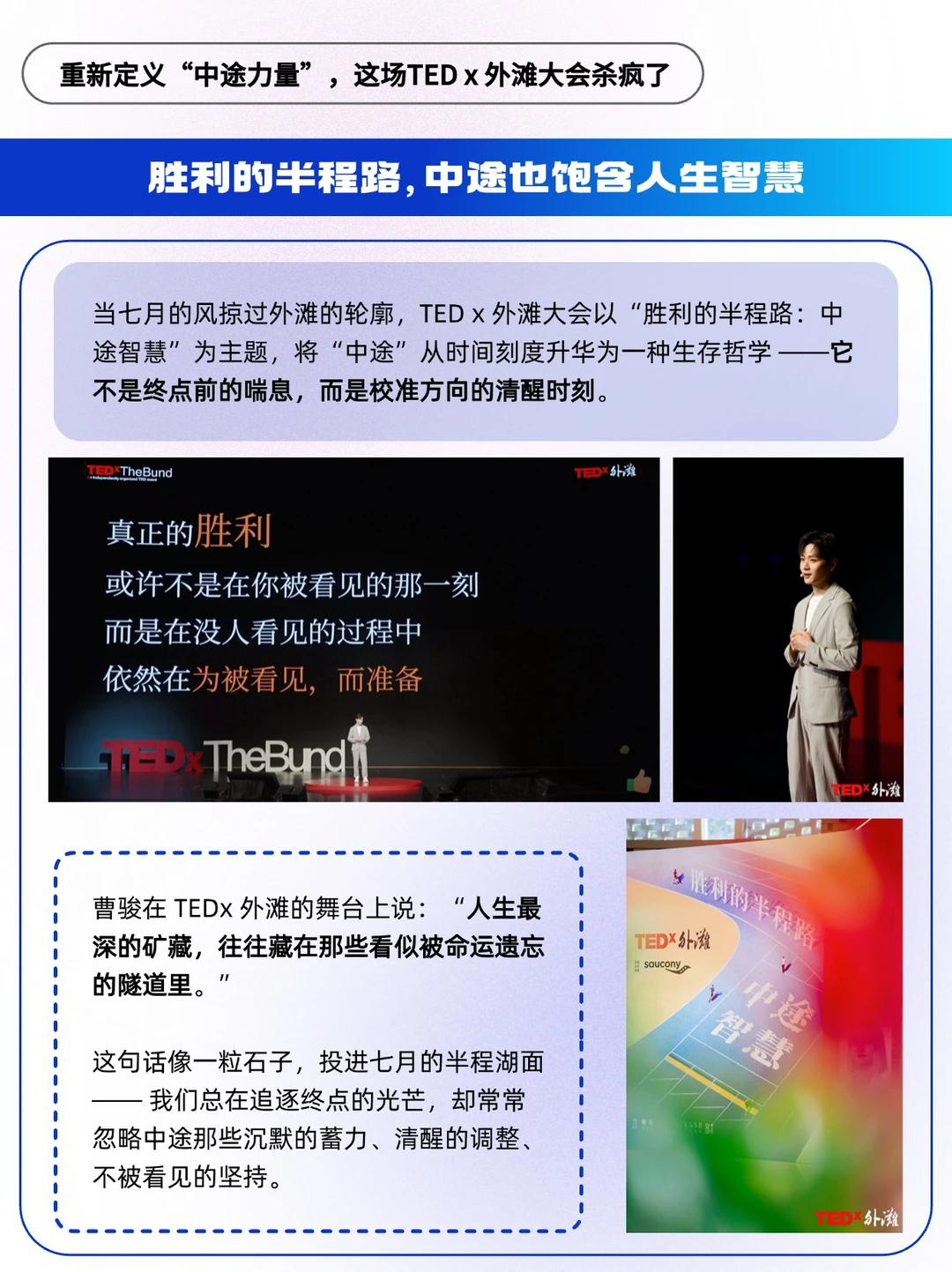 🔵曹骏在TEDx 外滩年度大会的舞台上说:“真正的胜利,或许不是在你被看见的那一刻,而是在没人看见的过程中,依然在为被看见,而准备” 。这句话像一粒石子,投进七月的半程湖面。我们总在追逐终点的光芒,却常常忽略中途那些沉默的蓄力、清醒的调整、不被看见的坚持。