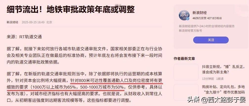 关于地铁审批新规,网络上讨论非常激烈,城市轨道交通新版规划申报规则收紧,4大关键信息影响各地轨交建设推进,具体如下: 1. 文件保密性强:新版规划申报通知属于密件,官方暂不公开其中具体内容。目前各地对新规的解读多依赖零星回应,导致规划编制缺乏明确公开标准,增加了申报筹备的不确定性。 2. 审批门槛提升:新规整体标准更高、要求更严,对全国范围内的新一轮规划申报均产生影响。从已有信息来看,门槛提升涉及经济、人口、运营成本等多维度,例如强化财政承载力审核、提高人口密度要求、新增运营期成本核算等,部分城市因不满足条件,已面临规划申报搁置风险。 3. 客流强度设硬标:新规对当前城市轨道交通线网的客流强度设定了明确标准,若线网客流强度不达标,城市将无法上报新一轮轨交规划。这一要求是对轨交运营实效的进一步考核,此前已有城市因客流强度不足,暂不具备规划报批条件。 4. 已批未建需重报:对于前一轮轨交规划中已获批复但尚未组织实施的项目,无论线路层级(如西安富机线这类多层次规划线路),均需按新规重新向国家发改委报批。不过目前政策落地存在区域传导时差,部分城市暂未收到正式文件,具体执行节奏尚未完全统一。 当前各地正根据新规要求补全前期工作,轨交审批逻辑已从“能否建设”转向“是否值得建、能否运营好”,满足客流、财政等新要求,成为城市推进后续轨交规划的关键。