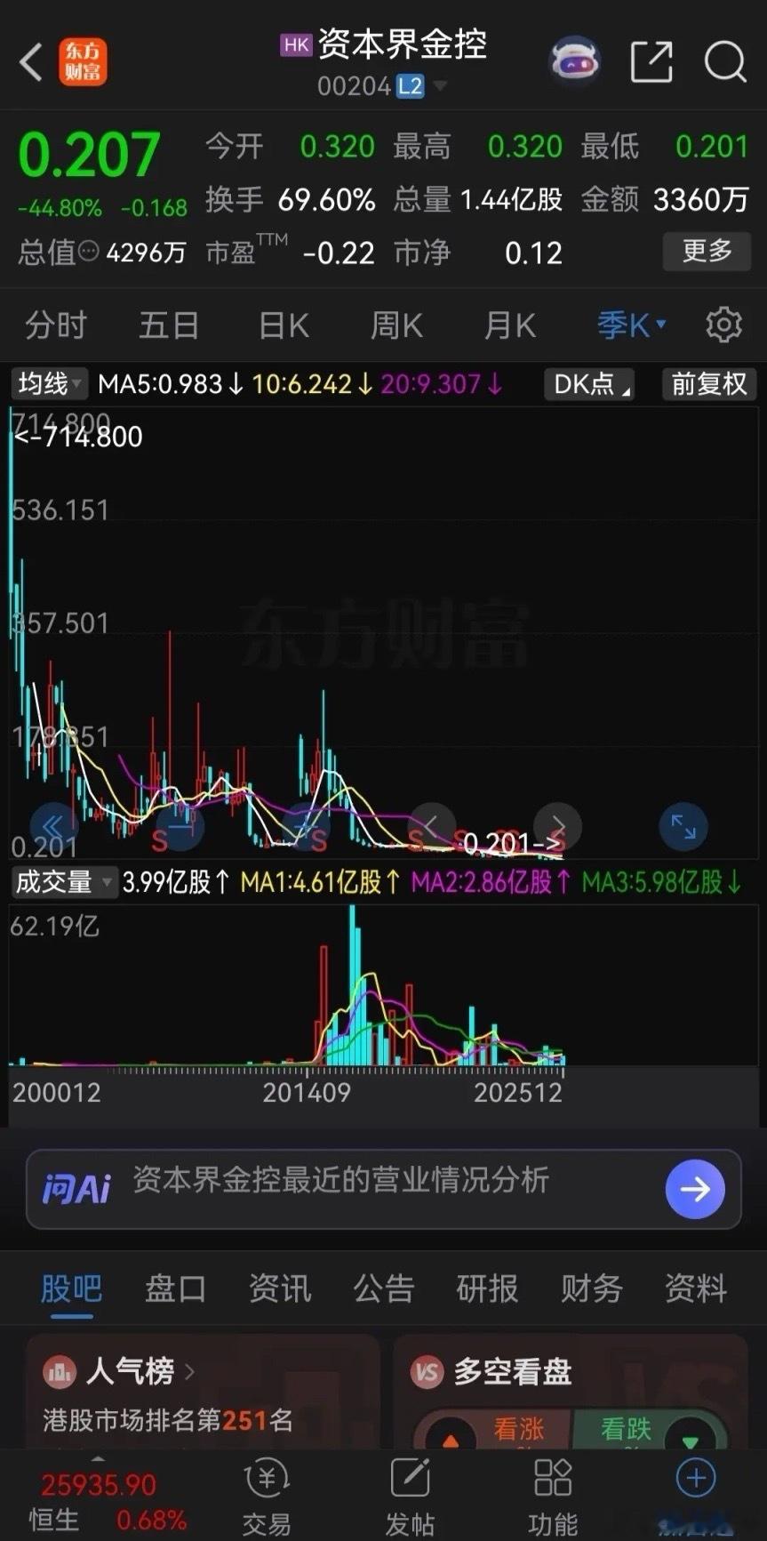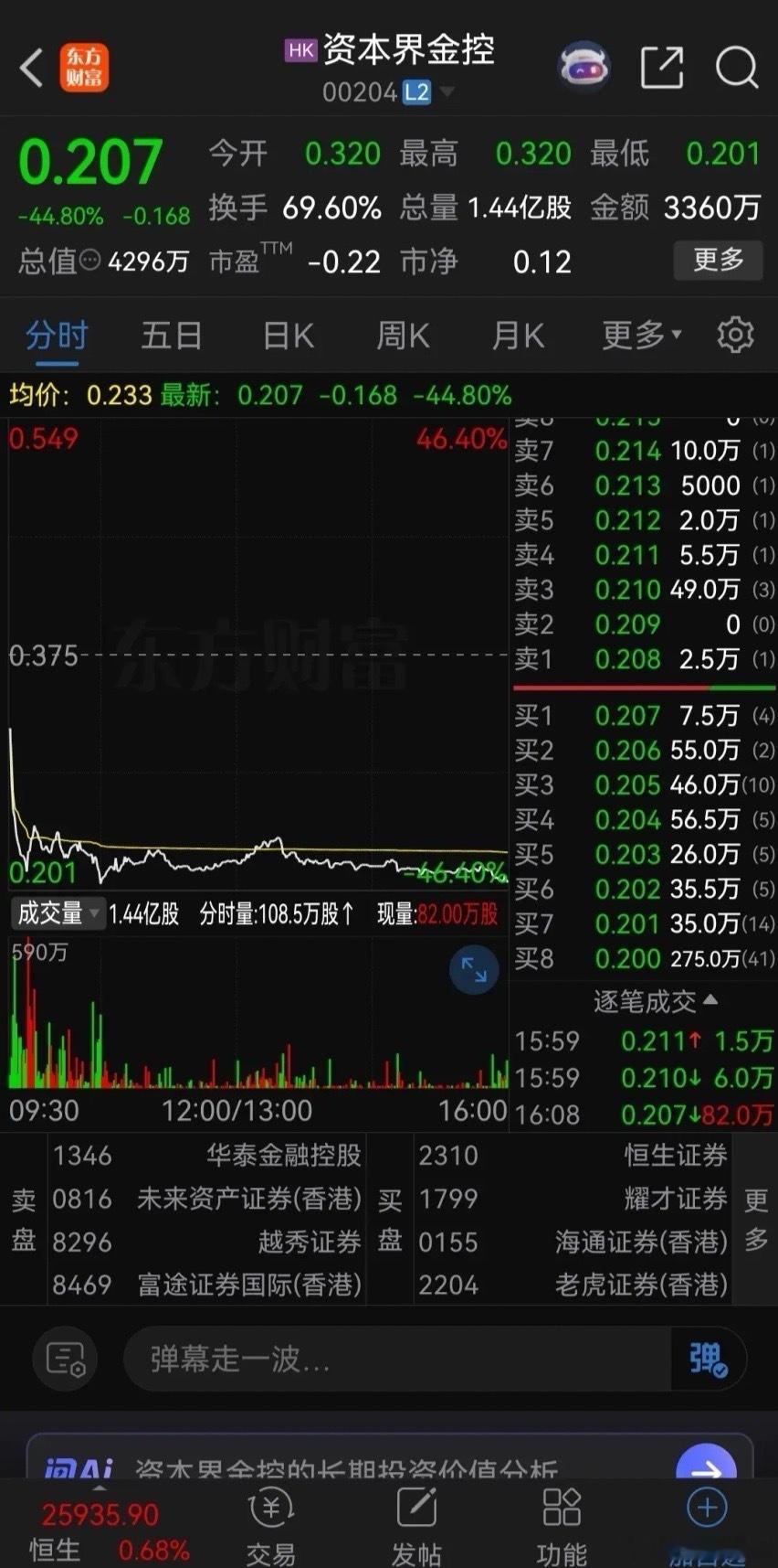 真惨!昨天暴跌71%,今天又暴跌44%!这跌幅真能吓死个人!港股上市的资本界金控,昨天暴跌71.15%后,今天又暴跌了44.80%,两天时间从1.3港元跌到了最低0.201港元,跌幅高达85%。很多人以为昨天暴跌71%,都想着今天会反弹去抄底,结果今天又来了个大瀑布,暴跌了近45%,这两天进场的股民全被一锅端了!而公司的历史最高价达714.8港元,目前已经较高点下跌了99.97%,几乎是跌没了,真正诠释了什么叫血本无归!
