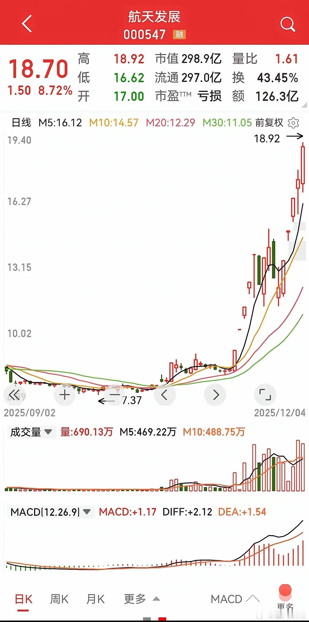 一只航天发展股票成交额高达126.3亿,是证券整个板块成交额的三分之二,一声叹息大A赌徒多啊。再看看五大银行今日成交额,工商银行12亿、农业银行16.87亿、中国银行14.74亿、建设银行5.65亿、交通银行10亿,合计59.26亿,不及航天发展成交额的一半。一只近16亿流通盘的股票,一天换手率快到一半了,那些买入者是在搏明日还有人来推涨停板吗?我们小股民搞不懂。