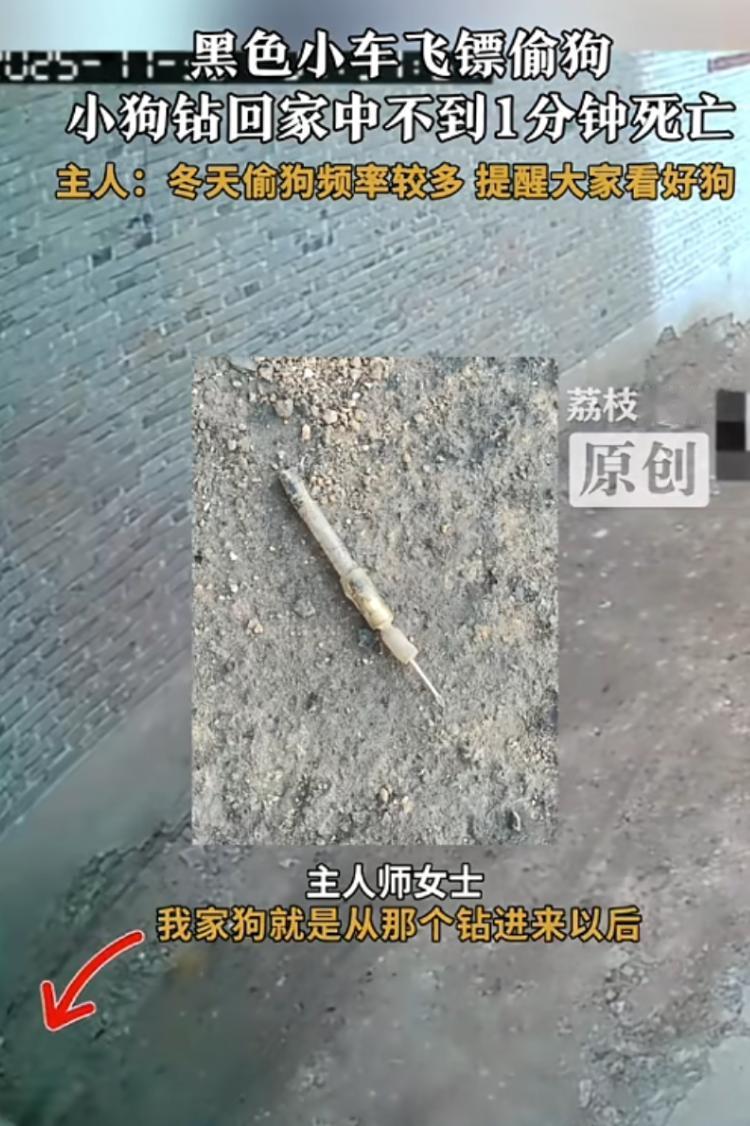 “必须严查!”11月30日,山西吕梁,一辆黑色轿车内,男子摇下车窗往狗身上打飞镖,被射中的小狗立马钻回家中,但刚进家门不到一分钟就死亡,虽然监控拍下了全过程,但是男子全程戴着口罩,显然是惯犯。网友:一定会遭报应! 这起事件远不止是简单的偷狗行径,更像是一场针对生命的精准猎杀,那枚小小的飞镖,就是夺走小狗性命的致命凶器,里面大概率装填了琥珀胆碱,一种受严格管制的医用肌肉松弛剂。这种药物一旦进入生命体,会快速麻痹呼吸肌,进而引发心肺衰竭,短短几十秒就能夺走生命。 从监控画面里能清晰看到,小狗被飞镖射中后,立刻发出凄厉的惨叫,它凭着本能往家的方向狂奔,在它单纯的认知里,家是全世界最安全的港湾,只要跑回去就能躲过危险。 可它不知道,那枚毒镖已经给它判了死刑,刚冲进家门还没等主人师女士反应过来,它就瘫倒在地,在巨大的痛苦中没了气息,整个过程还不到一分钟,这一幕被网友称为 “死神的一分钟”,看得人脊背发凉。 更让人后怕的是这枚致命毒针,是在清晨的居民区里被公然射出的,当时街道上虽不算热闹,但随时可能有行人路过,要是飞镖偏离方向误伤了路人,或是有好奇的孩子捡到被丢弃的毒针,后果不堪设想,这早已不是单纯的伤害宠物,而是严重威胁公共安全的恶行。 最让师女士崩溃的是,这已经是她家第二次遭遇这种厄运了,此前她养的一只黑狗,也是在相似的套路下不明不白地死去,这次看着爱犬惨死在家门口,还在狗的尸体旁捡到了那枚致命飞镖,双重打击让她悲痛不已。 按常理来说狗肉市场入冬后需求增加、价格上涨,偷狗贼往往会盯上中大型犬,毕竟能卖出几百块的价钱,可师女士家的这只狗体型瘦小,在肉贩子眼里根本没多少经济价值。 可作案男子却依旧在确认周围无人后,毫不犹豫地下了死手,这就不得不让人细思极恐,他作案的目的,或许根本不是为了那点蝇头小利,而是把杀戮当成了乐趣或是单纯的坏。 从监控里能看到,男子全程把脸遮得严严实实,摇窗、射镖、驾车逃离的动作一气呵成,显然是个经验老道的惯犯,他以为戴上口罩、快速逃离就能逍遥法外,却低估了如今天网恢恢的力度。 他留下的行车轨迹、黑色轿车的大致轮廓,都已经成了警方锁定他的关键线索,目前警方已经介入调查,所有人都在等着这个伸出黑手的人付出应有的代价。 这起事件也给所有养宠家庭敲响了警钟:入冬后成了偷狗贼的作案高发期,哪怕是在家门口,也不等于绝对安全,短时间的散养都可能让爱犬成为毒镖的活靶子。 网友们的愤怒并非空穴来风,这种在居民区肆意投放毒镖的行为,既漠视了生命,又践踏了公共安全底线,唯有严惩,才能震慑此类恶行,给受害者和所有关注此事的人一个交代。 (信息来源:《黑色小车飞镖偷狗,小狗钻回家不到1分钟死亡主人:冬天偷狗频率较多提醒大家看好狗》荔枝新闻)