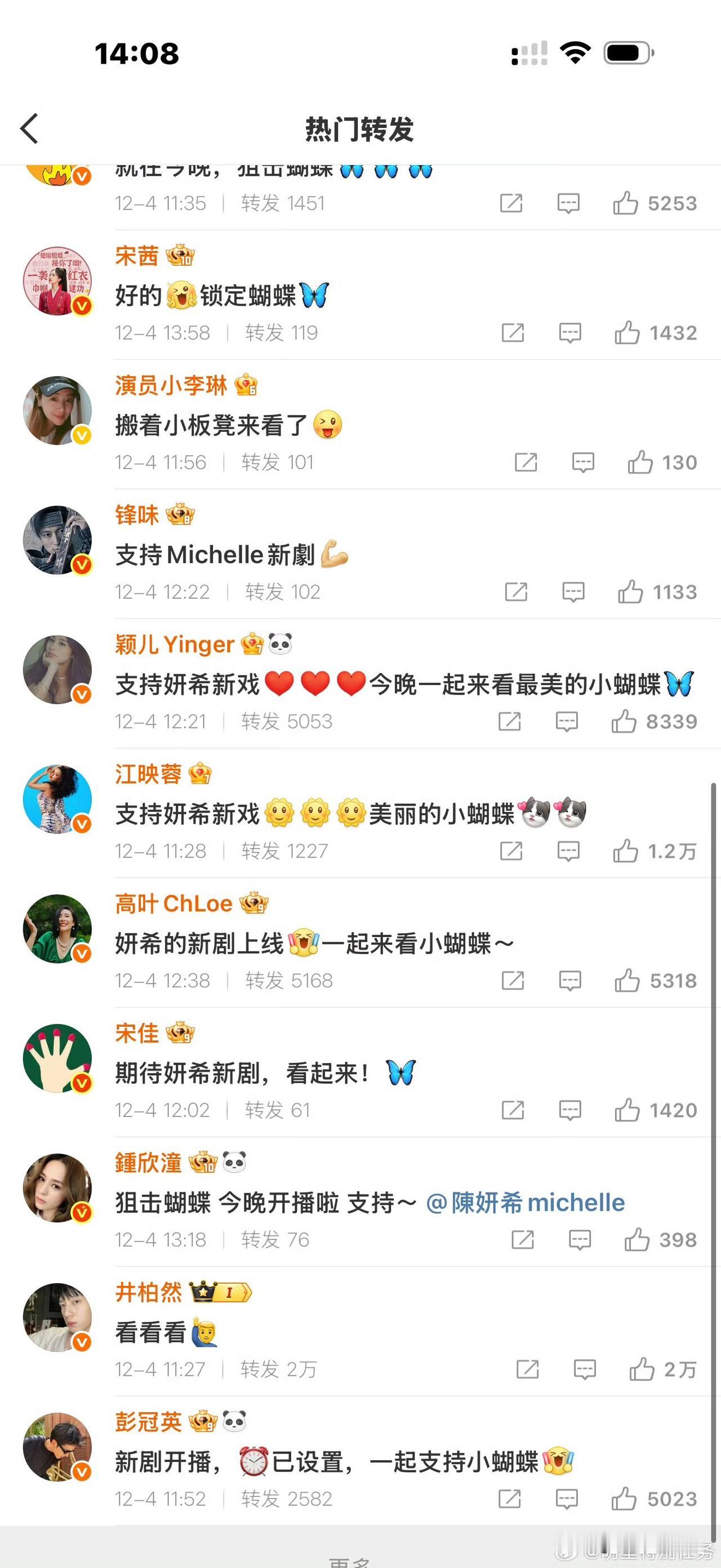 陈妍希想要赢一个人的心,今天到达了极致,她就想要争一口气。 陈妍希和陈晓离婚后的第一次交集,那就是《大生意人》和《狙击蝴蝶》同时期对打。 今天陈妍希摇了娱乐圈一半的大咖来宣传,决心很明显,那就是超越陈晓的收视,社交能力也是强的可怕,堪比当年的杨紫,只是社交能力不代表扛剧能力,明天自见分晓。