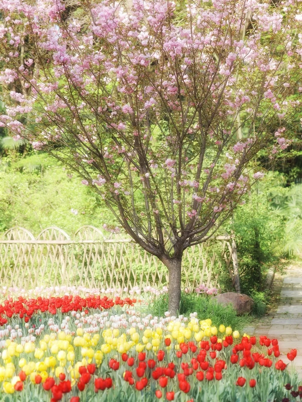 📝另外一片在往右手边走的湖边,穿过睡莲区就会看到,这一片面积更大,中间还有晚樱(地上有郁金香花海箭头指示)