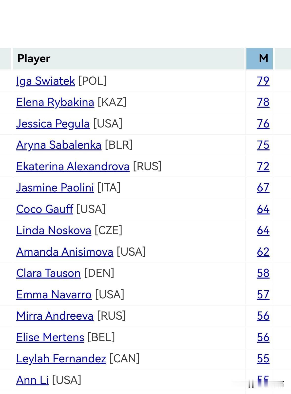 2025赛季WTA巡回赛“劳动模范”榜 (数字为参加比赛场次数) 伊贺·斯瓦泰克[波兰] 79 莱巴金娜[哈萨克斯坦] 78 杰西卡·佩古拉[美国] 76 萨巴伦卡[白俄罗斯] 75 亚历山德罗娃[俄罗斯] 72 保利尼[意大利] 67 可可·高夫[美国] 64 琳达·诺斯科娃[捷克] 64 阿曼达·阿尼西莫娃(美国)62 克拉拉·陶森[丹麦] 58 艾玛·纳瓦罗[美国] 57 米拉•安德烈耶娃[俄罗斯] 56 伊莉斯·默滕斯[比利时] 56 莱拉·费尔南德斯[加拿大] 55 安·李[美国] 55