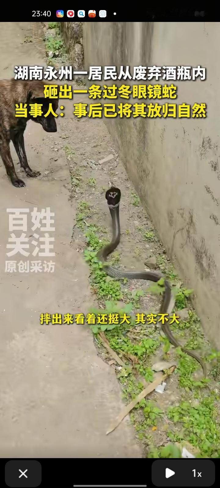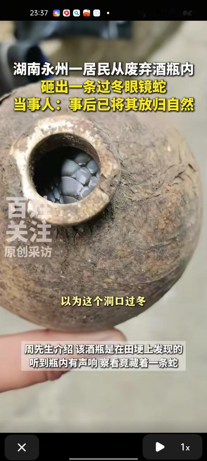 12月4日,永州市江永县。居民在废弃酒瓶里砸出一条过冬的眼镜蛇,这酒瓶是在田埂上发现的,里面有一丝声响,这么小的酒瓶钻进去还是第一次见。他判断,眼镜蛇钻入瓶内不久,事后已将其带至山上放归自然。