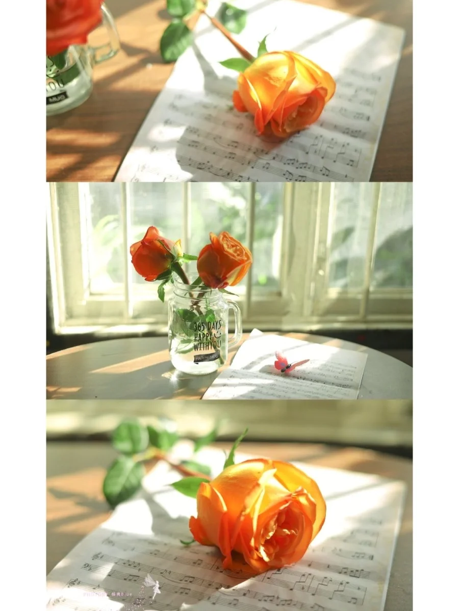 以白色窗框和窗外的绿色为背景,把花放在阳光照射的区域,开大光圈咔嚓一顿狂拍,15分钟后我得到了这组图(注意高光区域不要过曝)