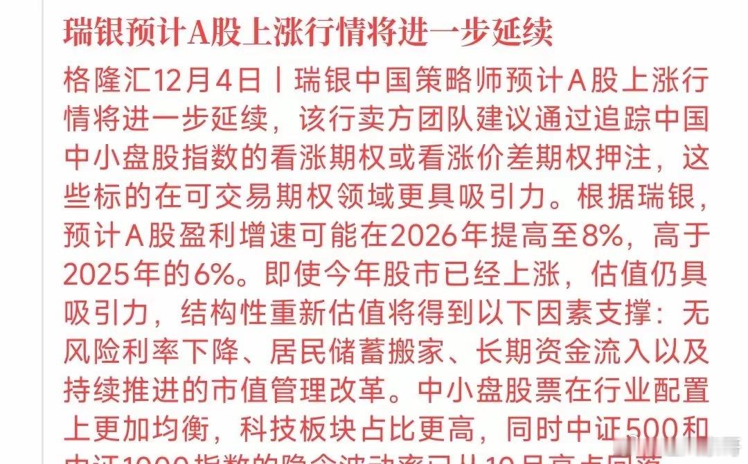 大机构看好A股接下来的行情,认为2026年会有8%的涨幅瑞银预测2026年中国股市将会受到青睐,主要原因有以下几个1.居民储蓄搬家。现在散户的钱基本都在银行存定期,随着利率的降低,这部分钱会有一部分拿出来投资,这是股市上涨的动力2.长期估值处于低位。对于外资来说有很大的吸引力3.长期资金流入也会增多其实A股今年从3000点到4000点,只有科技股和银行板块在涨,别的板块基本上都没有涨,这部分板块未来只要补涨,A股的上升空间还有很大。而且科技股的上涨空间还有很大,机器人和人工智能都是未来产业,还有很大的预期空间。