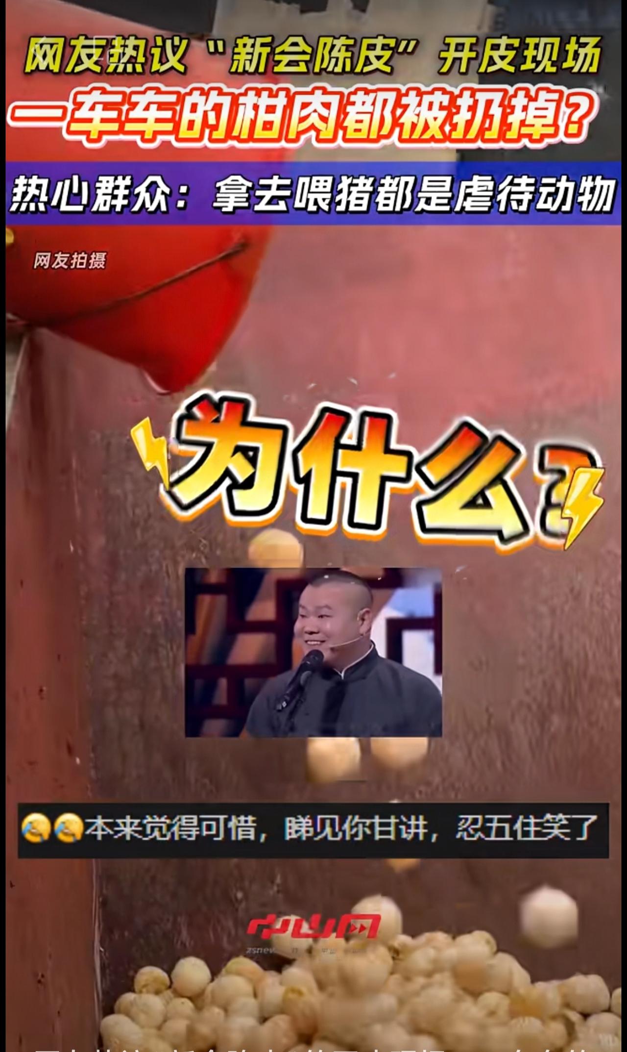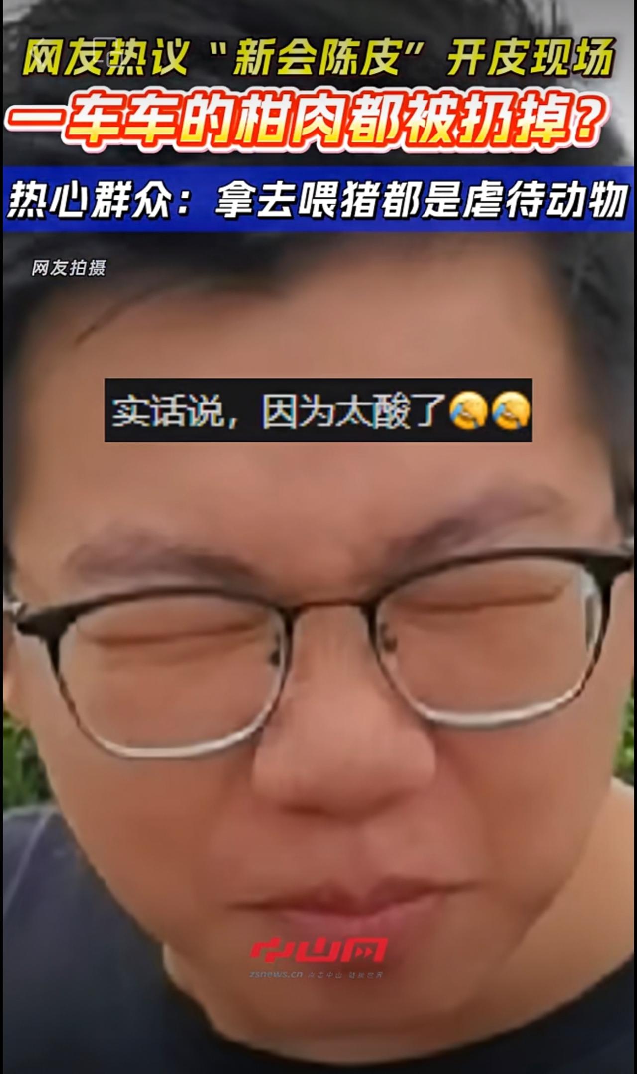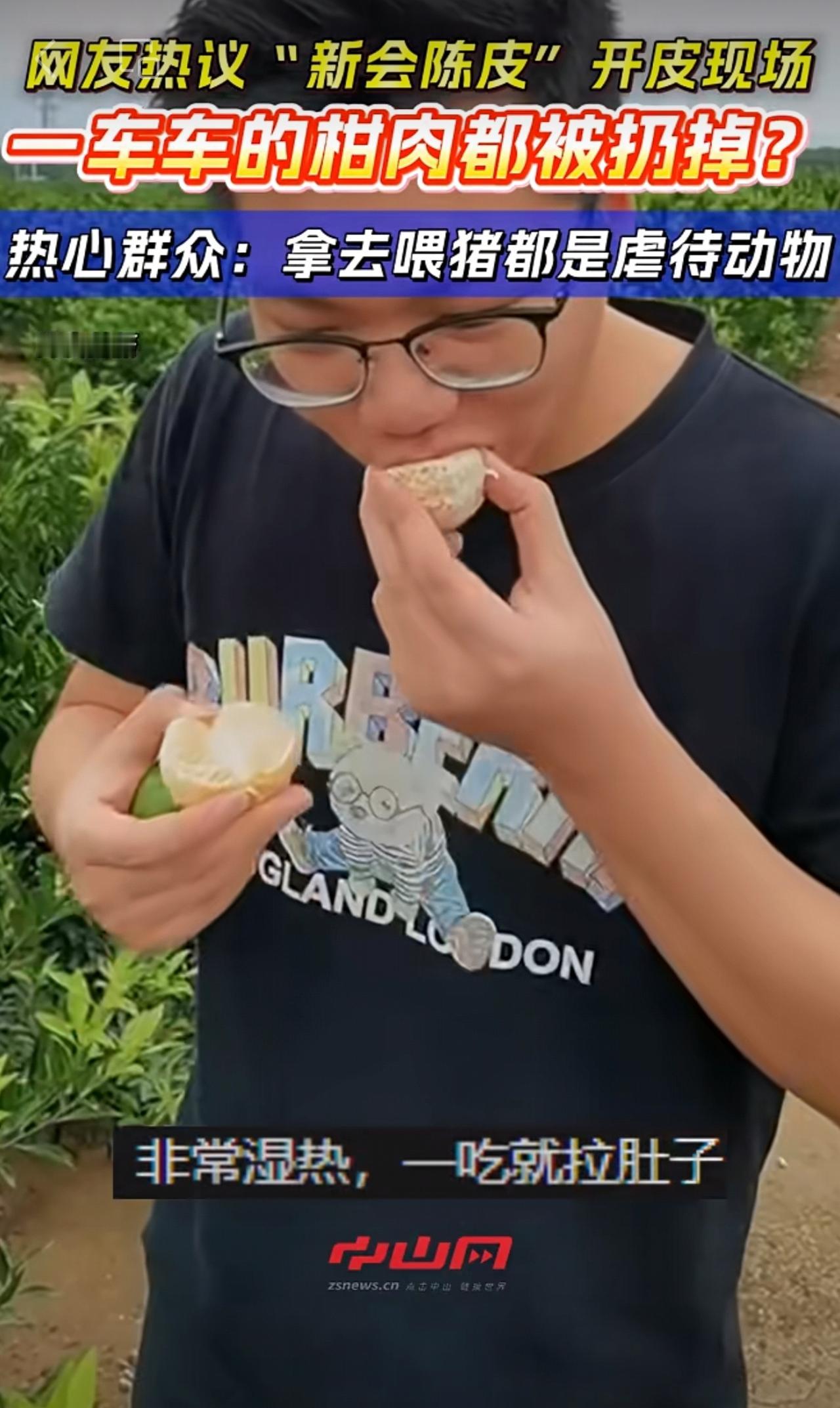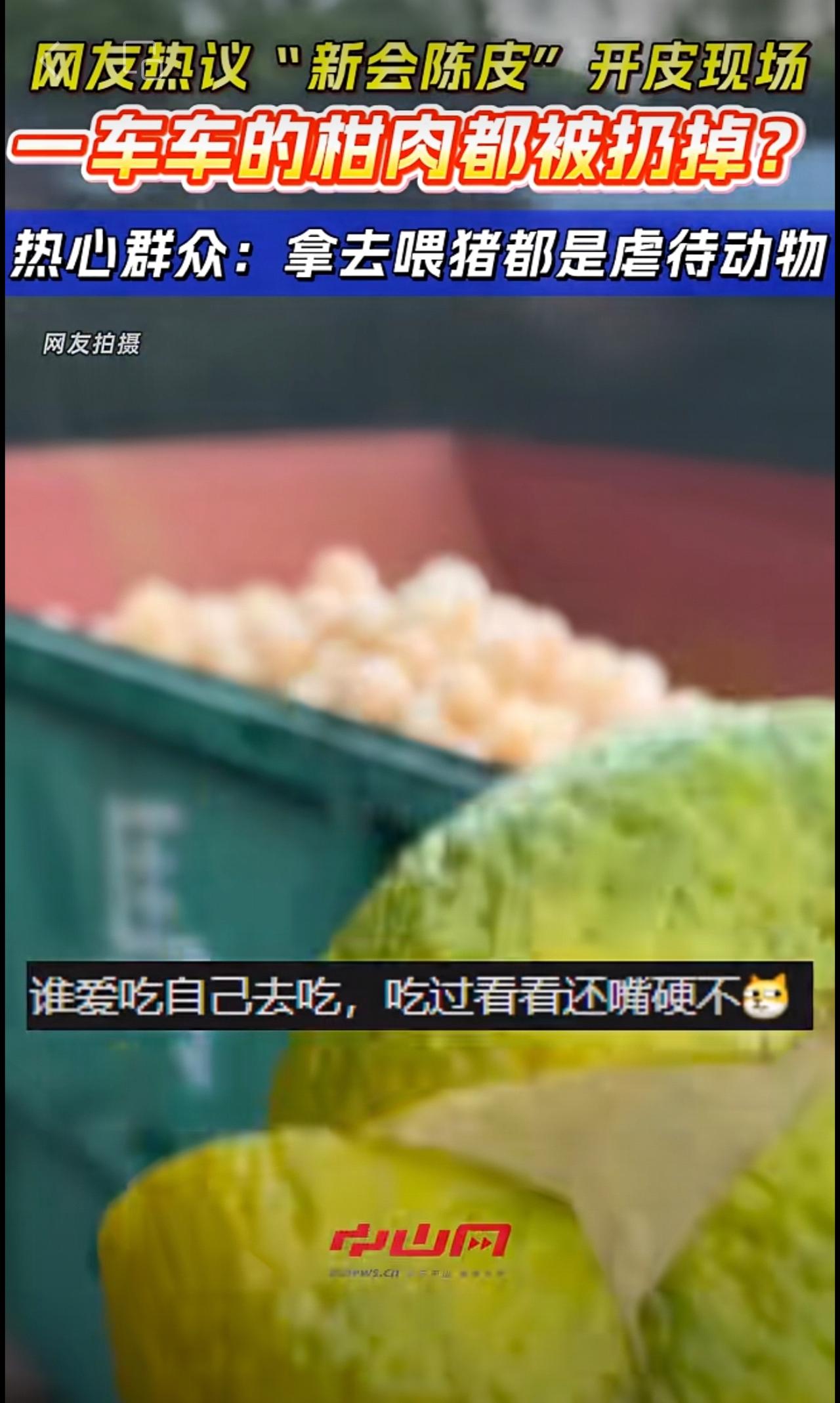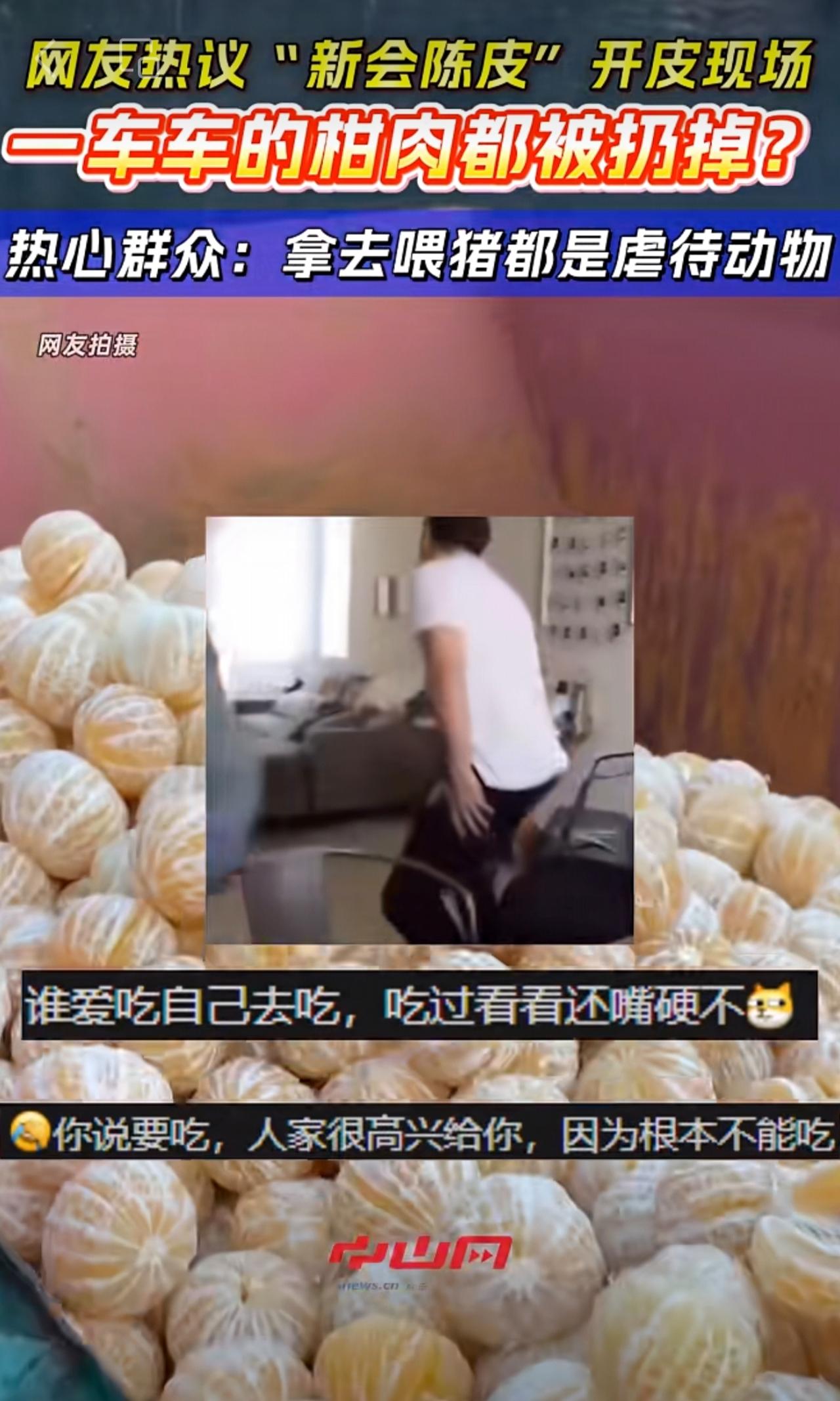 网友热议“新会陈皮”的开皮现场,一车车的柑肉都被扔掉?热心群众:拿去喂猪都是虐待动物(信息来源羊城晚报)