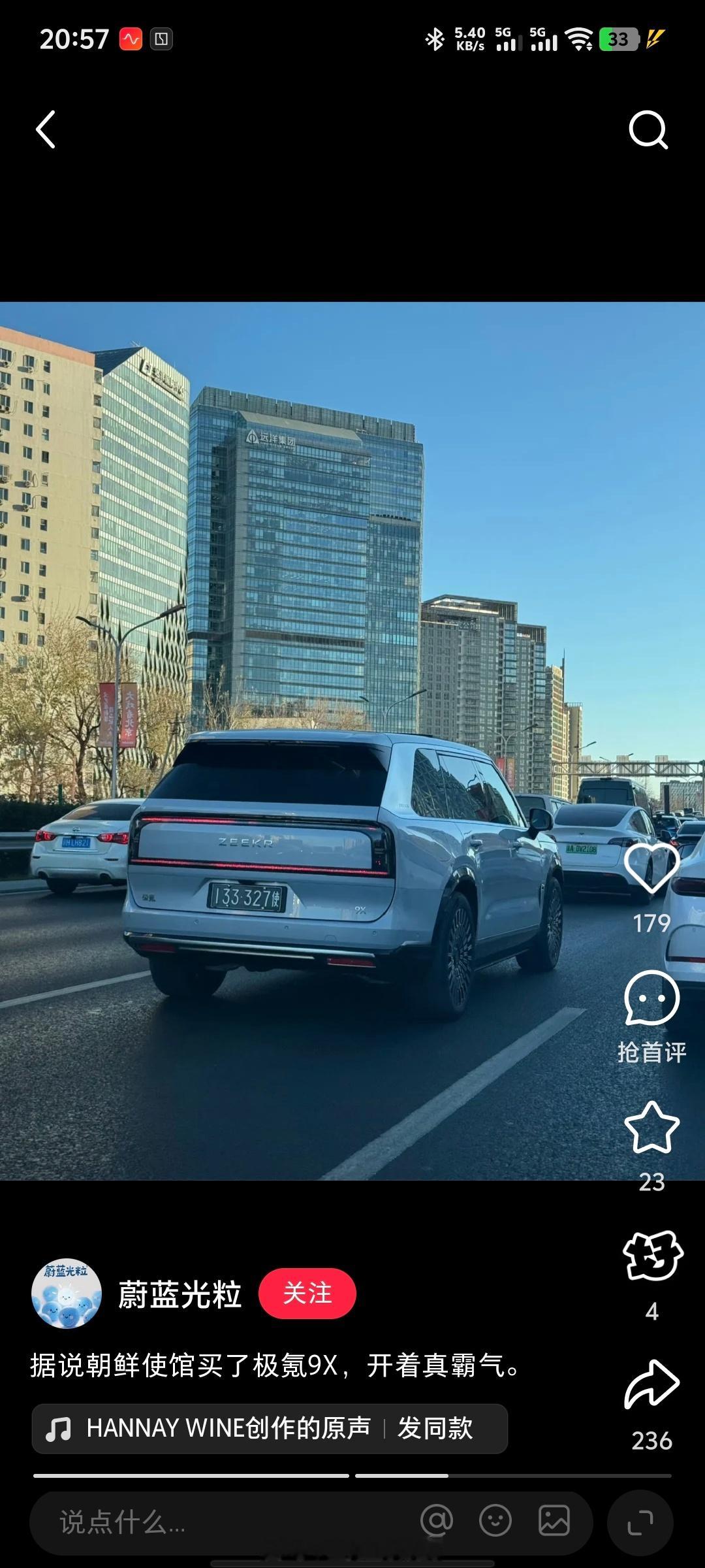 小红薯转来的,朝鲜使馆的极氪9X,不得不说,主体的汽车品味一直是在线的