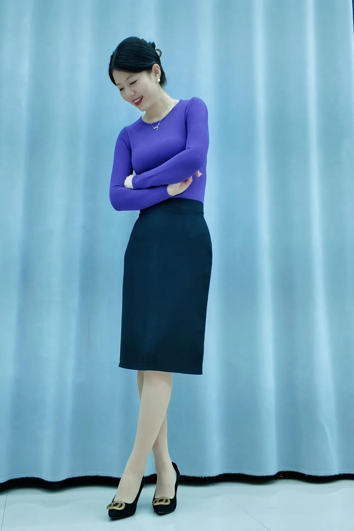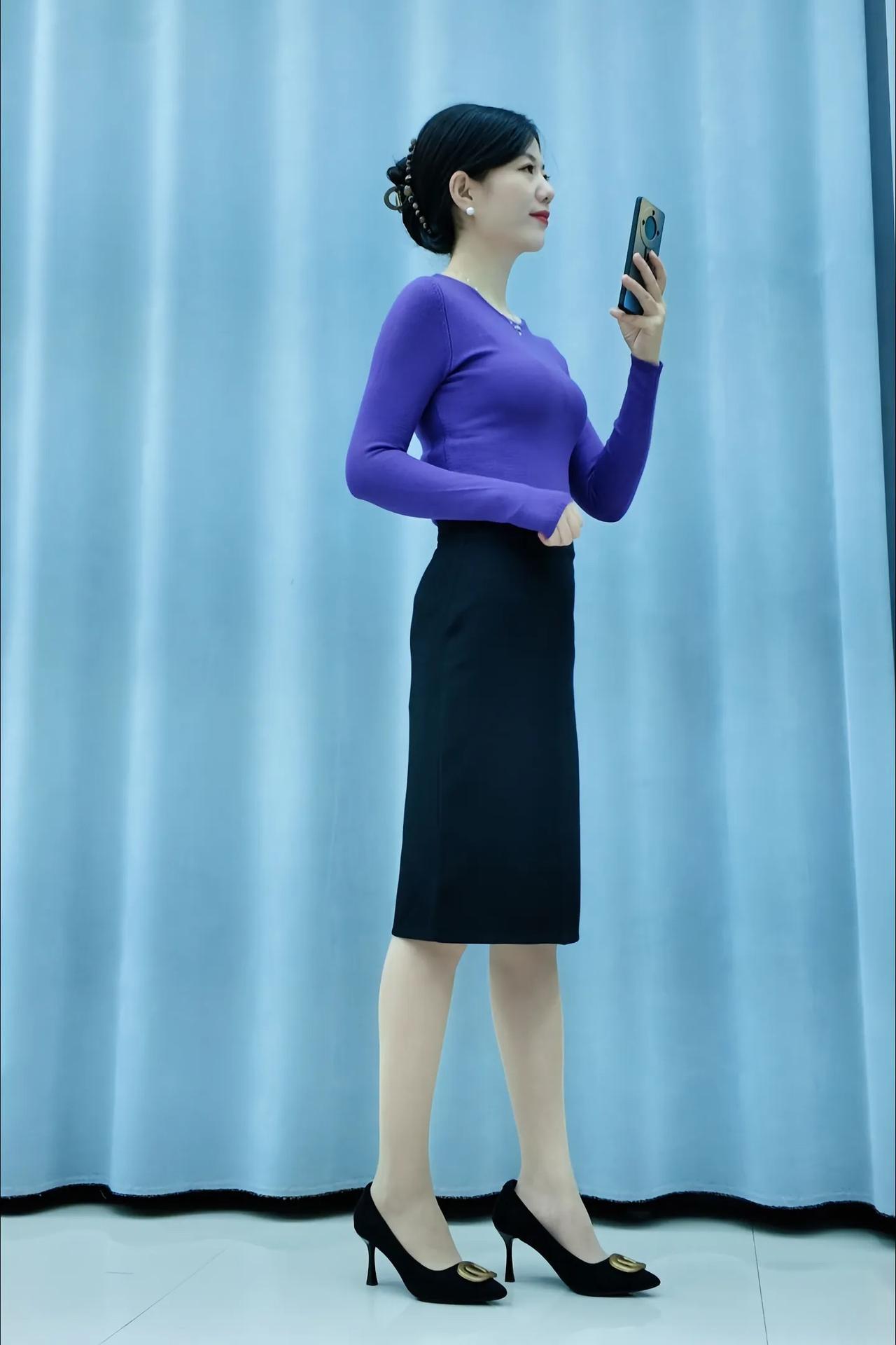 优雅气质穿搭,紫色上衣搭配深蓝半身裙,自信微笑,尽显女性魅力!