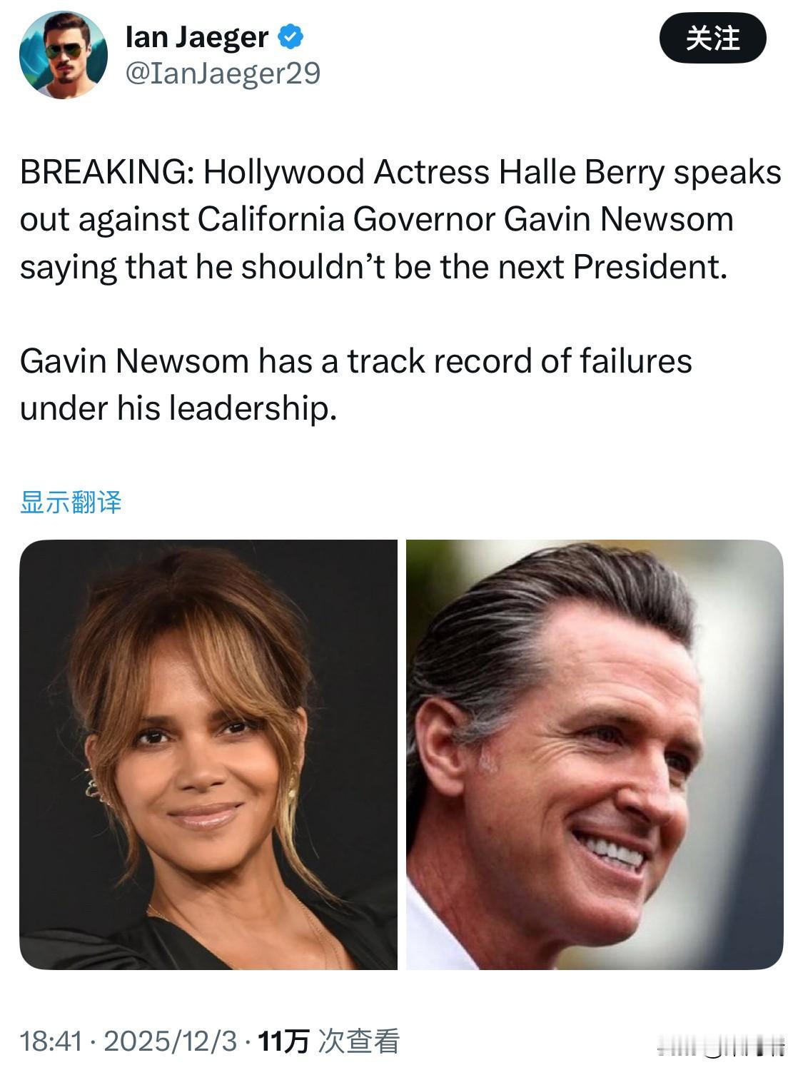 突发新闻:好莱坞女星哈莉·贝瑞公开反对加州州长加文·纽森,称他不应该成为下一任总