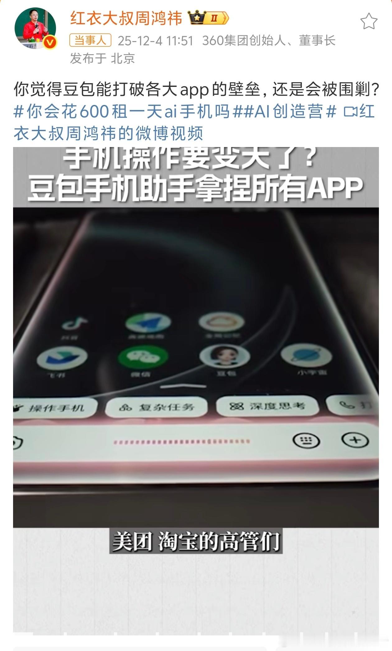 周鸿祎称豆包手机冲垮大厂护城河周鸿祎的这个观点很犀利啊,他认为豆包手机冲垮了大厂的护城河。我倒是觉得这样挺好的,我现在就是豆包用的最多,体验很好。手机自带的AI除了修图就是语音,别的我用的不多。现阶段的AI,豆包第一梯队应该没有质疑声吧。