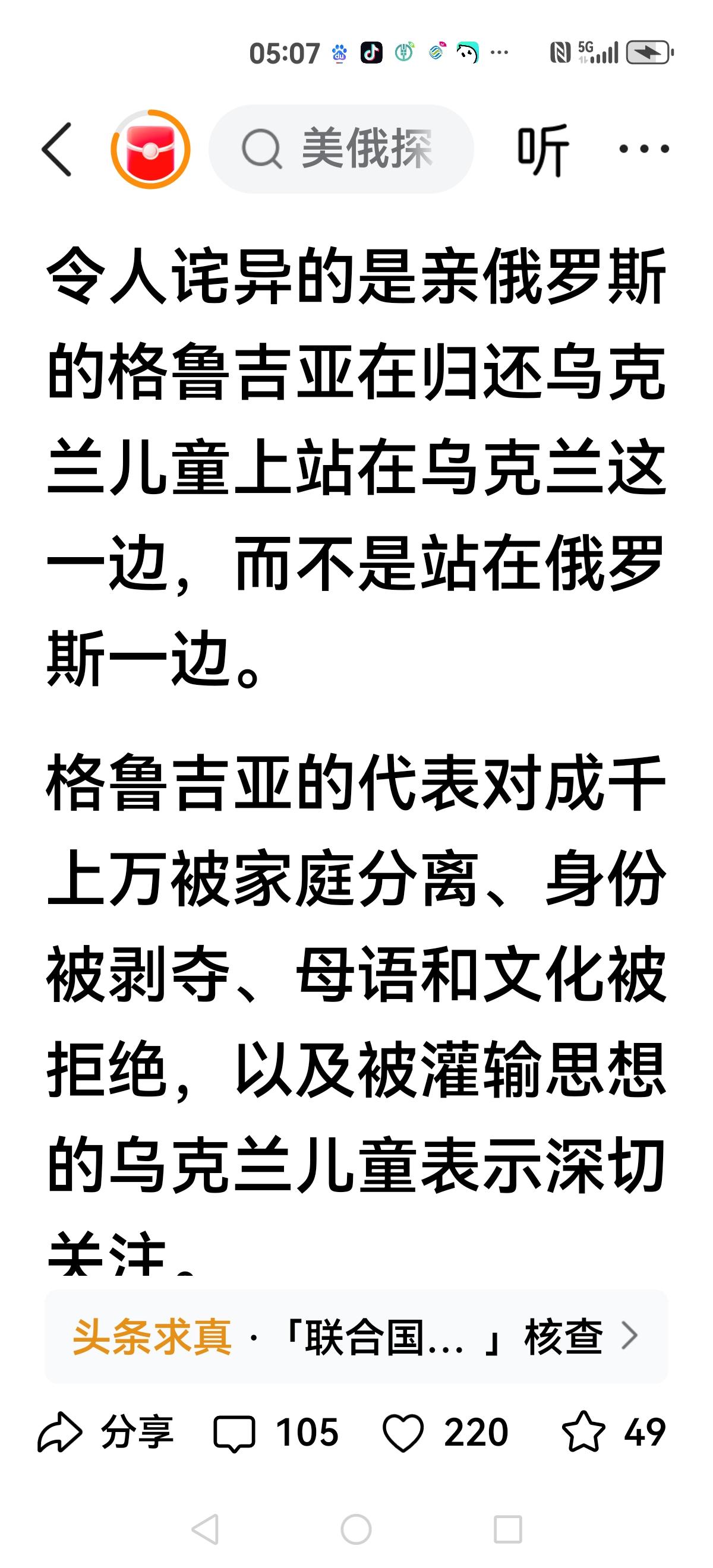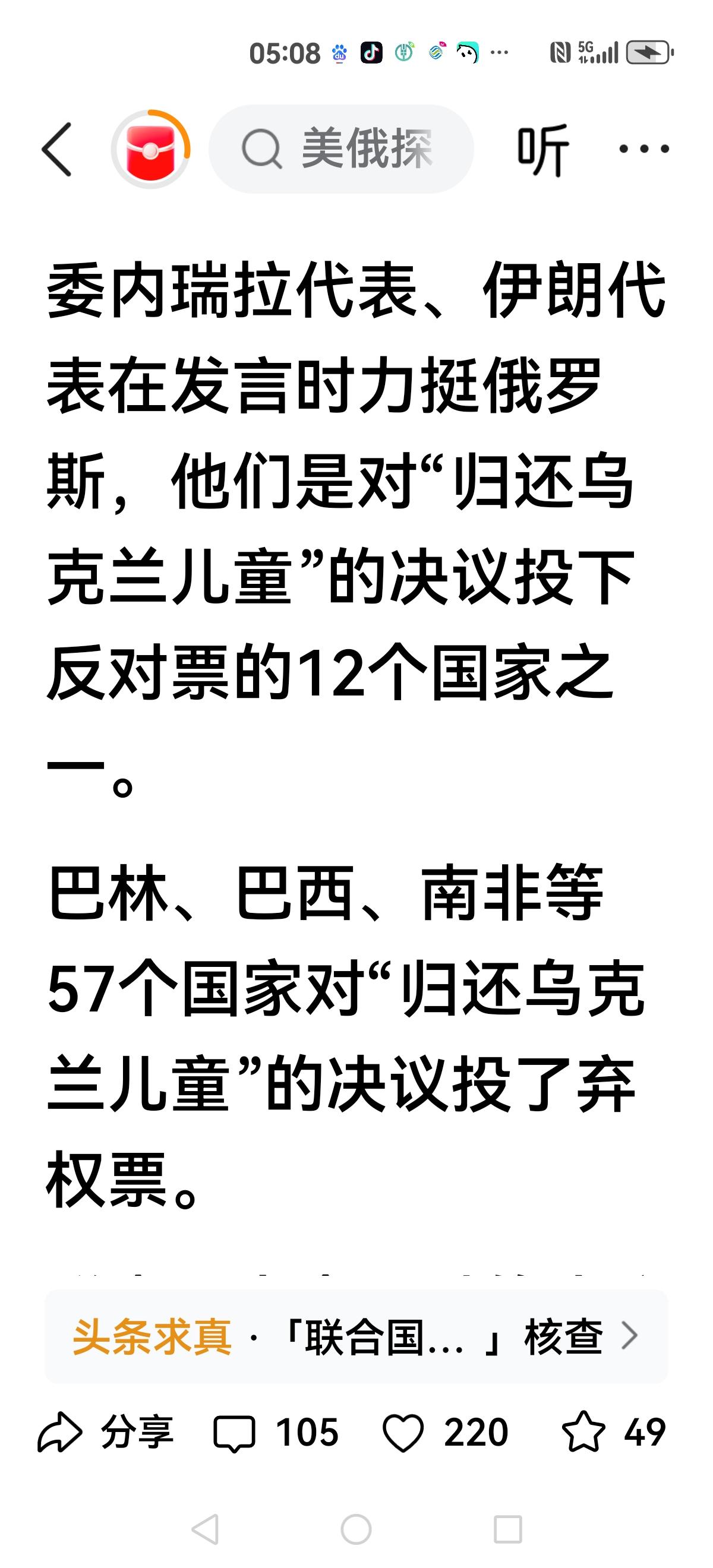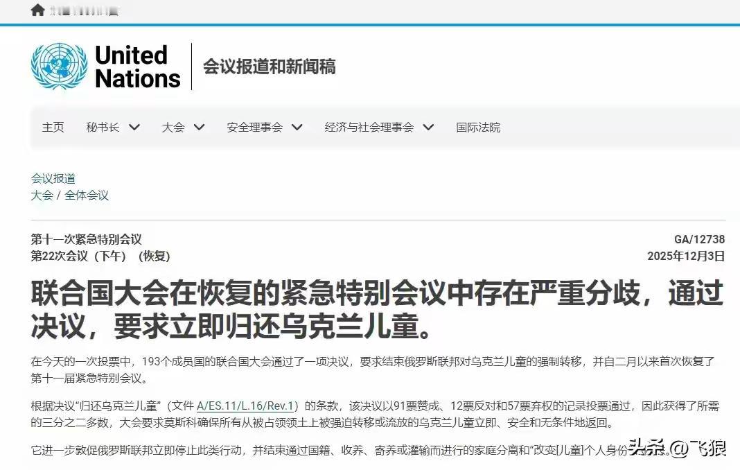 【俄罗斯又输一次】 91票赞成、12票反对!联合国通过决议:要求俄立即归还乌克兰儿童 在这次表决中,亲俄的格鲁吉亚也投了赞成票,委内瑞拉,伊朗等投了反对票。 巴林,巴西,南非等57个国家投了弃权票。 这一次俄罗斯又输了一局,这种做法明显是违背人道主义,强行给儿童改变环境与语言。
