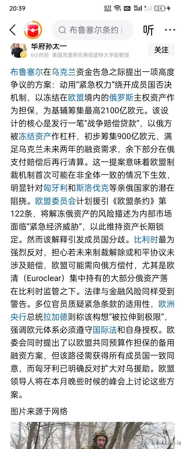 操碎了心! 目前战争中的乌克兰,资金非常紧张,似乎已经到了差不多无以为继的程度了,欧盟委员会好像急的不得了,可能是根据冯德莱恩的要求,立即根据《欧盟条约》第122条的“紧急经济威胁”的有关规定,将目前冻结的俄罗斯资产和帮助乌克兰筹措资金的事情,干脆划到“紧急经济威胁”的范围,搞出一个以冻结的俄罗斯资产做担保,为乌克兰筹集2100亿欧元。据说,如果进入到“紧急经济威胁”这样的情况而作出的决定,就好像不用需要欧盟成员国的一致同意,也就是任何欧盟成员国都没有了一票否决权,估计就是欧盟成员国只要得到多数票通过即可。 这种方式看起来似乎完美无缺,问题迎刃而解,但好像仍然是遭到了比利时政府的激烈反对。然而,既然是没有了一票否决权,无论比利时反对、还是别的少数国家反对,似乎也没有任何决定性的作用。这种情况,似乎也证明了,只要努力去做,办法总比困难多。 其实,欧洲不知道是否有点笨,如果他们学习学习使用辩证法的方式,或者使用民主集中制的方式,这个事情根本就是小菜一碟,小事一桩。