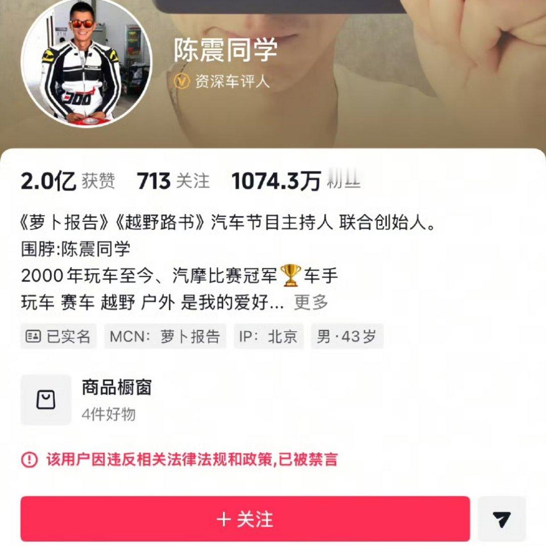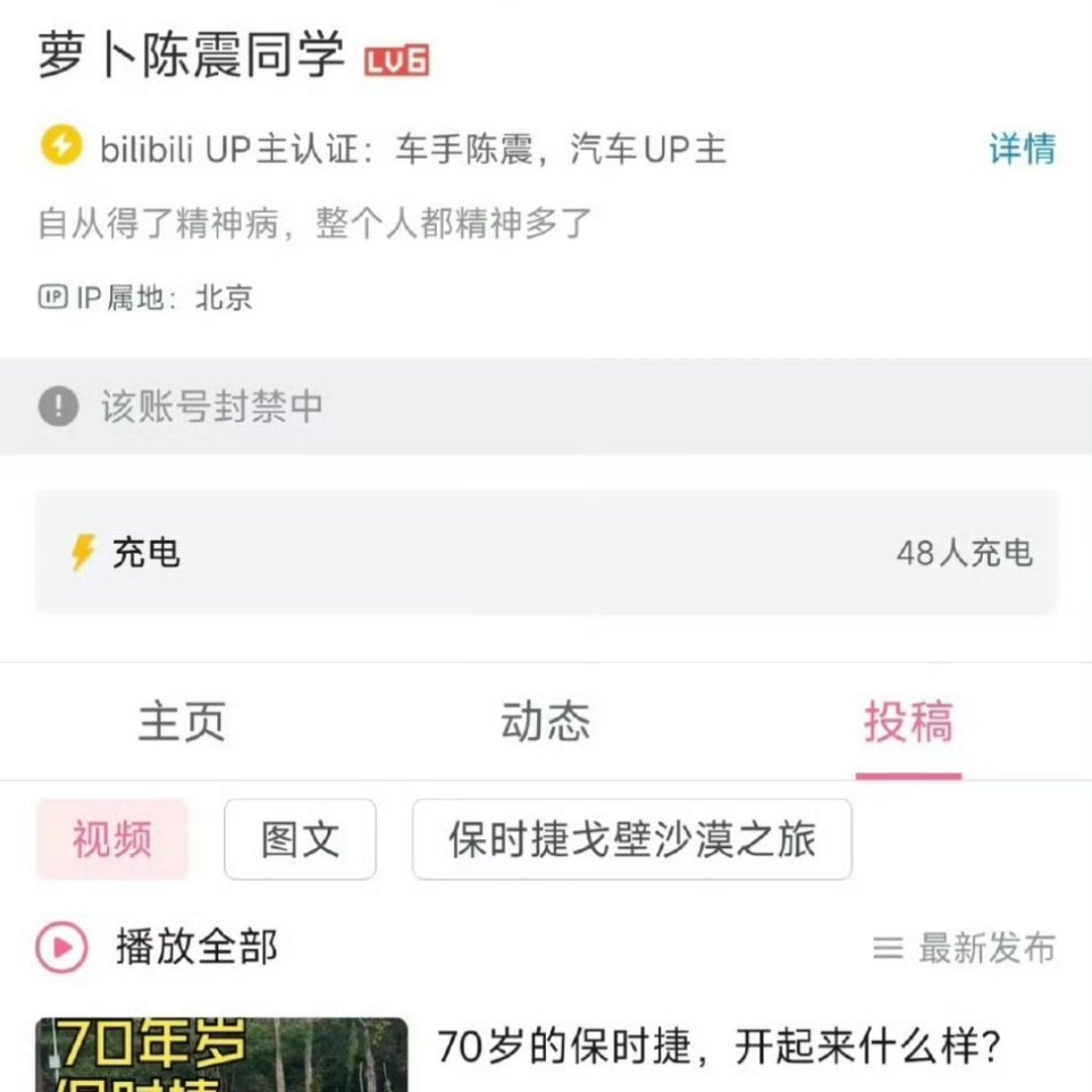 陈震在微博、抖音、小红书、B站被全面禁言,作为顶流大V毫无底线,整天煽动情绪,制造对立,活该被封。