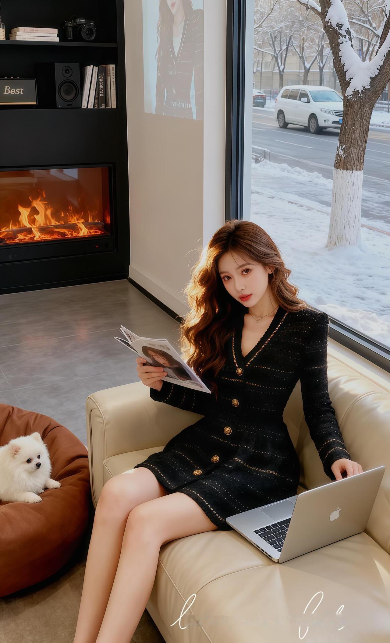 冬日暖阳下,时尚女孩享受阅读与工作的美好时光。