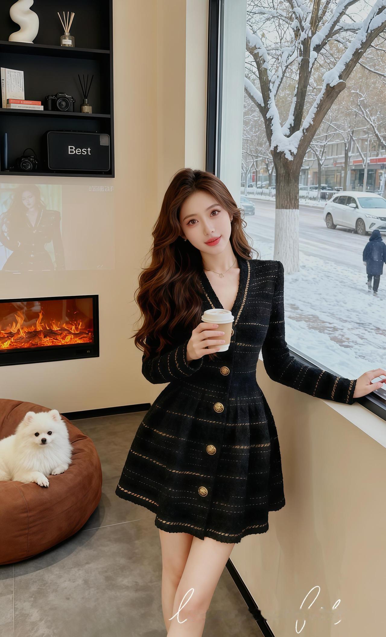 优雅气质穿搭,灰色毛衣搭配黑色短裙,简约时尚。