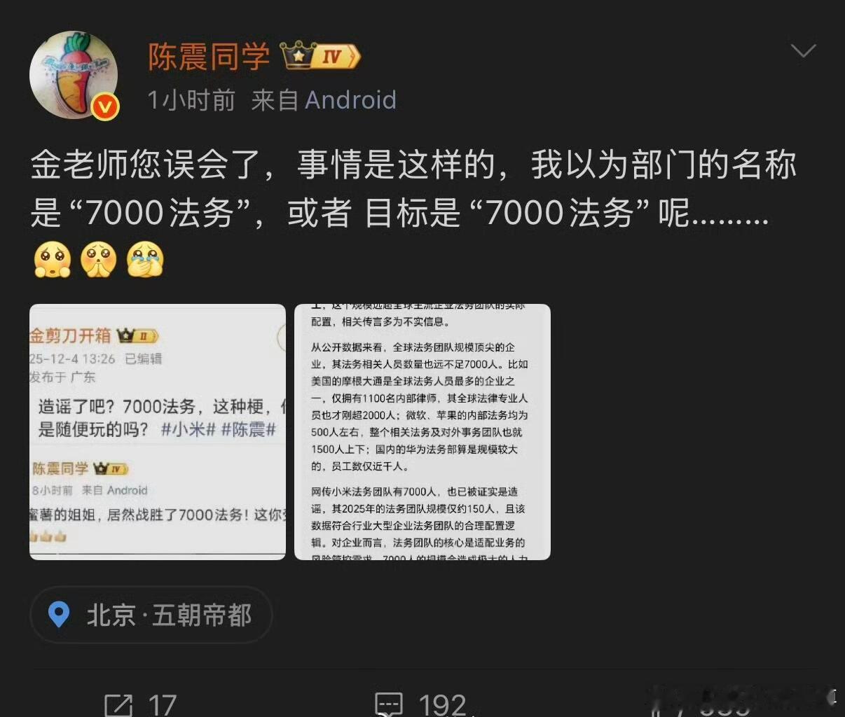 深夜!车圈大V陈震突然被禁言了!不少网友发现他的抖音已显示禁言状态,微博、B站等平台也陆续标上“违反法规”“账号封禁”。信息显示,其在12月4日还发过帖,在聊“7000法务”的话题。近期他的争议集中在两点:一是反复聊“7000法务”的梗,二是小米捐赠1000万港元驰援香港火灾时,他一句“不管出于什么原因”引发众怒,被指阴阳企业捐款动机。陈震被禁言热点观点华俊竹有话说 陈震被禁言
