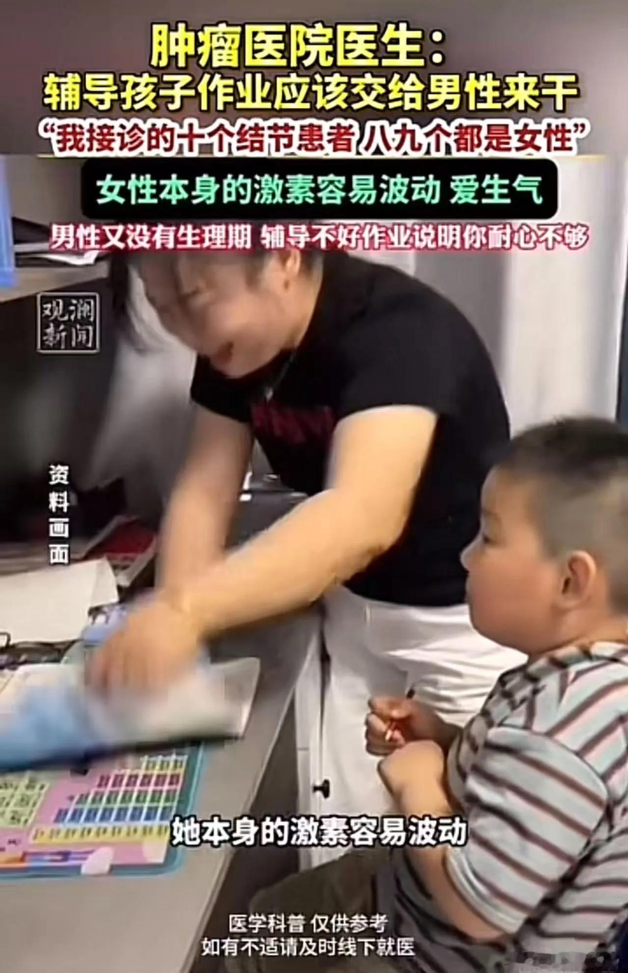 肿瘤医院医生:“我呼吁,辅导孩子作业的这个事情,应该交给男性来干!我接诊的十个结节患者八九个都是女性,他们真的不容易……” 这位肿瘤医院的医生提到“辅导孩子作业应由男性来干”,其实反映出一种对家庭角色分工的思考,也引发了不少人的共鸣和讨论。 首先,医生提到“我接诊的十个结节患者八九个都是女性”,这可能暗示着女性在家庭和职场中承担了太多压力,身体和心理都承受着巨大负担。长时间的压力、焦虑甚至身体健康问题,确实是现代社会中不少女性面临的现实。 关于“辅导孩子作业应该由男性来干”的观点,虽然带有一定的偏见,但也反映出一些家庭中存在的角色错位和期待差异。有些人认为,男性在家庭中的角色应该更多地承担起“家庭支柱”和“孩子教育”的责任,以减轻女性的压力。这也是一种呼唤家庭成员共同分担、平衡家庭责任的声音。 然而,实际上,孩子的教育和家庭的责任应该是全家人的共同努力,而不是单一性别的责任。家庭教育的核心是合作与理解,无论是父亲还是母亲,只要愿意参与,都能为孩子的成长提供良好的支持。 这位医生的发言,也提醒我们:社会和家庭都需要更加关注女性的健康和心理状态,减少性别偏见,让每个人都能在家庭和工作中找到平衡。家庭责任的分担,应该是“人人有责”,而不是“谁该做什么”的刻板印象。 总之,这个观点虽然有些偏激,但也引发了我们对家庭角色、性别责任以及女性健康的深思。希望未来,更多的家庭能实现“责任共享”,让每个人都能在家庭和社会中,找到属于自己的位置和价值。每天分享一点人生感悟