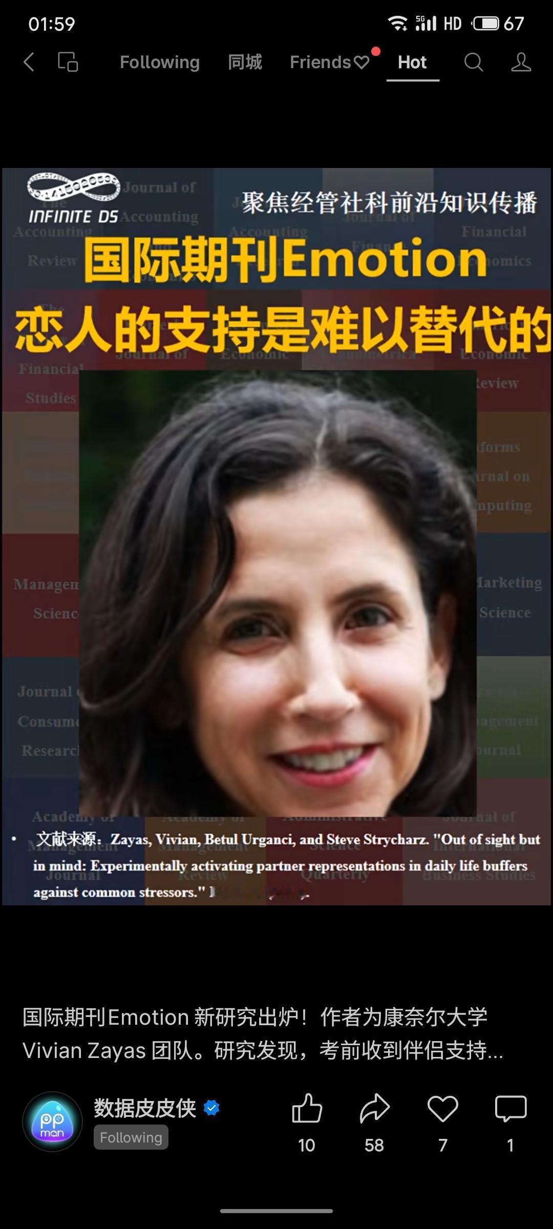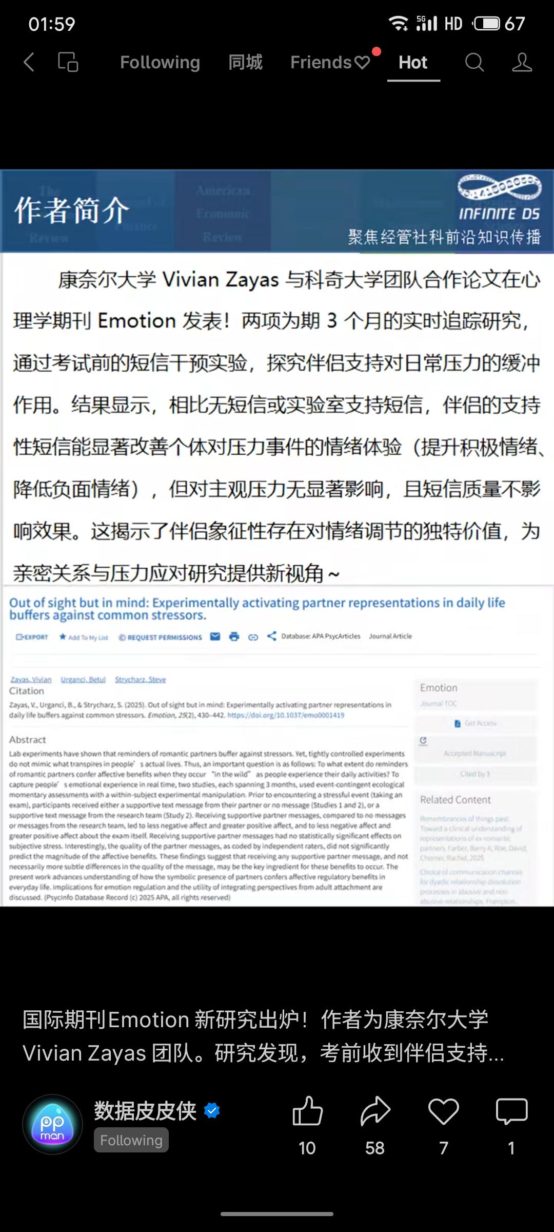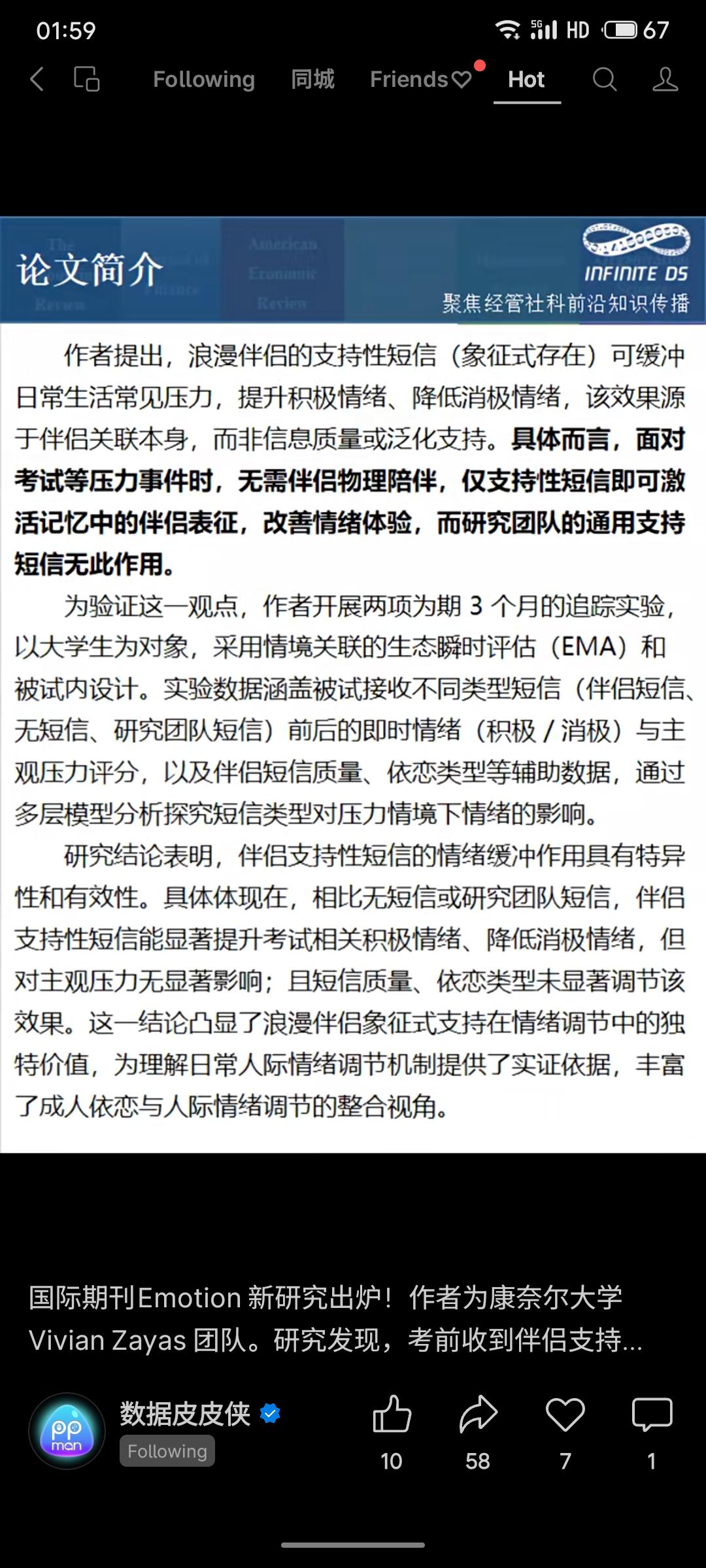 康奈尔大学团队在《Emotion》发表研究,通过两项追踪实验发现:在考前等压力情境下,收到伴侣的支持性短信(相比无短信或研究团队短信)能显著提升积极情绪、降低消极情绪,但对主观压力影响不显著。该效果与短信质量无关,凸显了伴侣象征性支持在情绪调节中的独特作用。