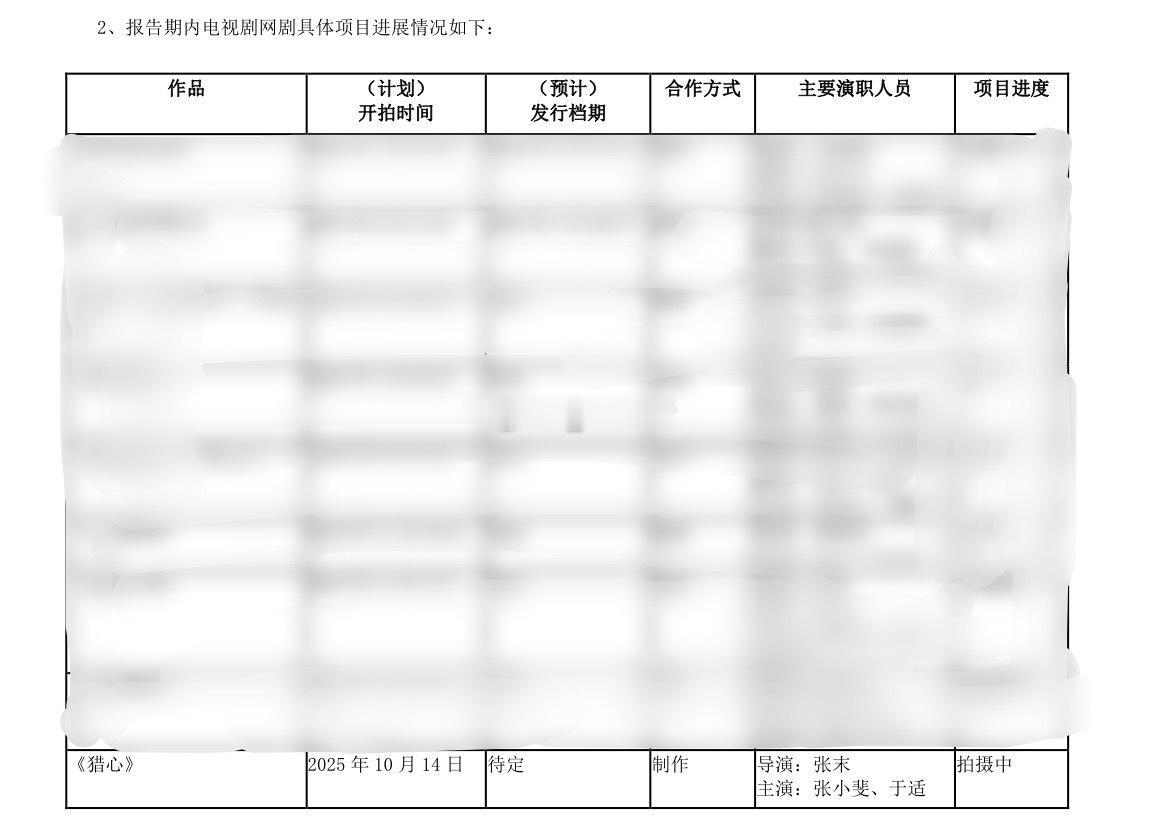电视剧猎心 据北京文化第三季度报告显示,张末导演,张小斐、于适主演的电视剧《猎心》于2025年10月14日开机,发行档期待定,项目进度:拍摄中电视剧猎心张小斐电视剧猎心于适猎心