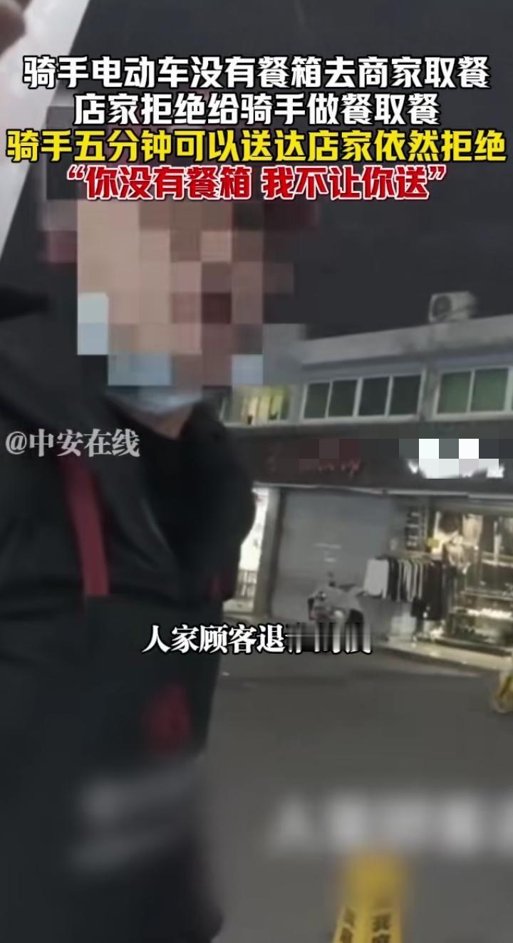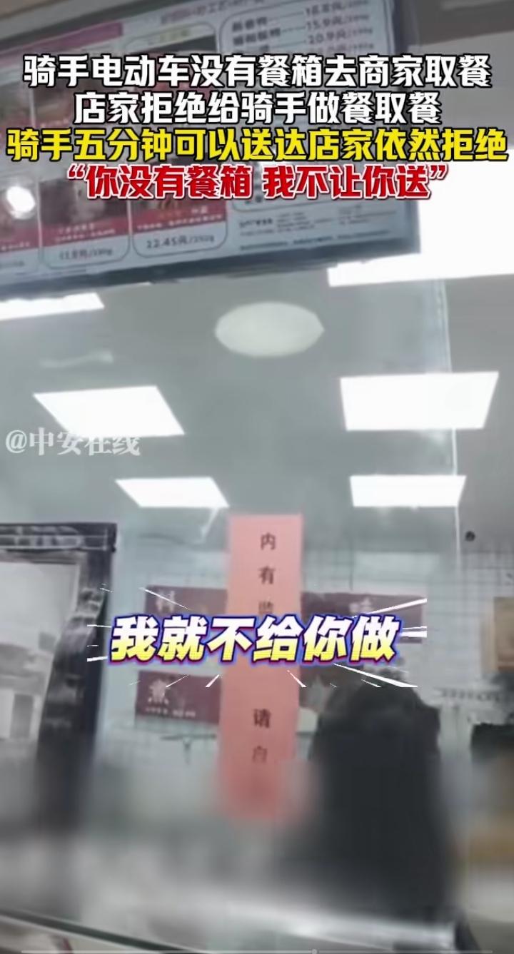 近日浙江杭州,晚上7点,一外卖小哥去店里取餐,谁料,小哥刚进店,老板就说这个订单不给你送,老板的理由是这样的! 老板看见小哥骑着个电动车就来了,连餐箱都没有,这么冷的天,餐一下就冷掉了!老板不给小哥做餐,不让他送!小哥却说自己5分钟就能送到了,要什么箱子?不给送你就取消订单吧!老板不理小哥,反正就是不给他出餐!大家觉得老板的做法对吗?