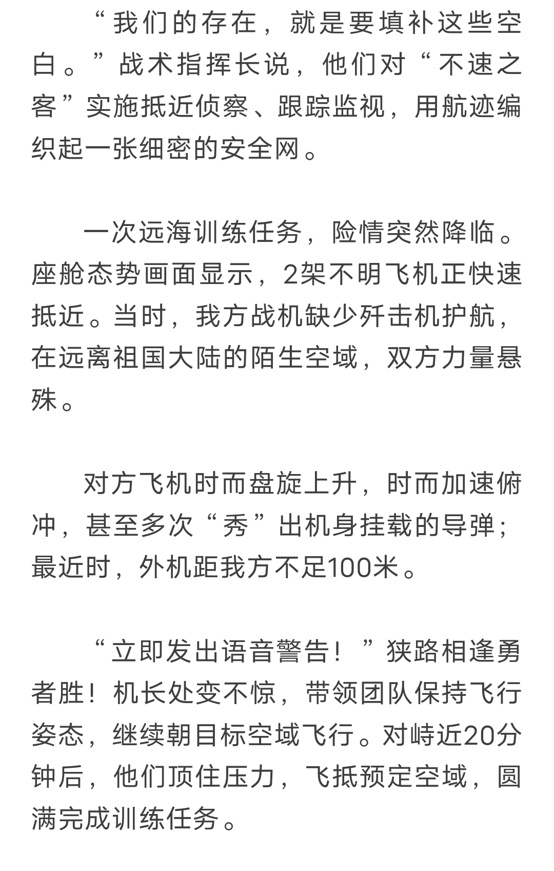 厉害了!不到100米,预警机/巡逻机(500或巡逻机)单刀逼退2架外军飞机,而且亮出了导弹,对峙20分钟!根据央广军事报道:(东部战区战机曾遇险情,与2架外机对峙近20分钟):一次远海训练任务,险情突然降临。座舱态势画面显示,2架不明飞机正快速抵近。当时,我方战机缺少歼击机护航,在远离祖国大陆的陌生空域,双方力量悬殊。对方飞机时而盘旋上升,时而加速俯冲,甚至多次“秀”出机身挂载的导弹;最近时,外机距我方不足100米。“立即发出语音警告!”狭路相逢勇者胜!机长处变不惊,带领团队保持飞行姿态,继续朝目标空域飞行。对峙近20分钟后,他们顶住压力,飞抵预定空域,圆满完成训练任务。★:至于导弹你尽管猜,飞机也就那么几种,配图是空警500。说明咱们飞行员底气十足,艺高人胆大!烽火问鼎计划每天认识一件兵器