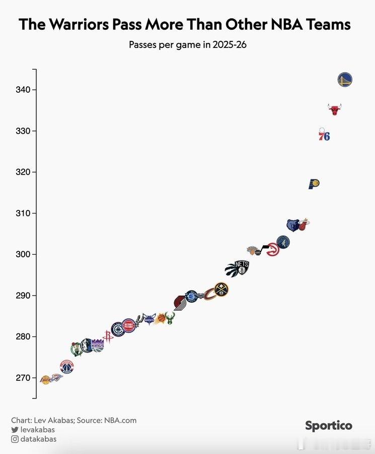 NBA 勇士本赛季场均传球次数联盟最多,但进攻效率第23。湖人最少&第7!勇士vs76人