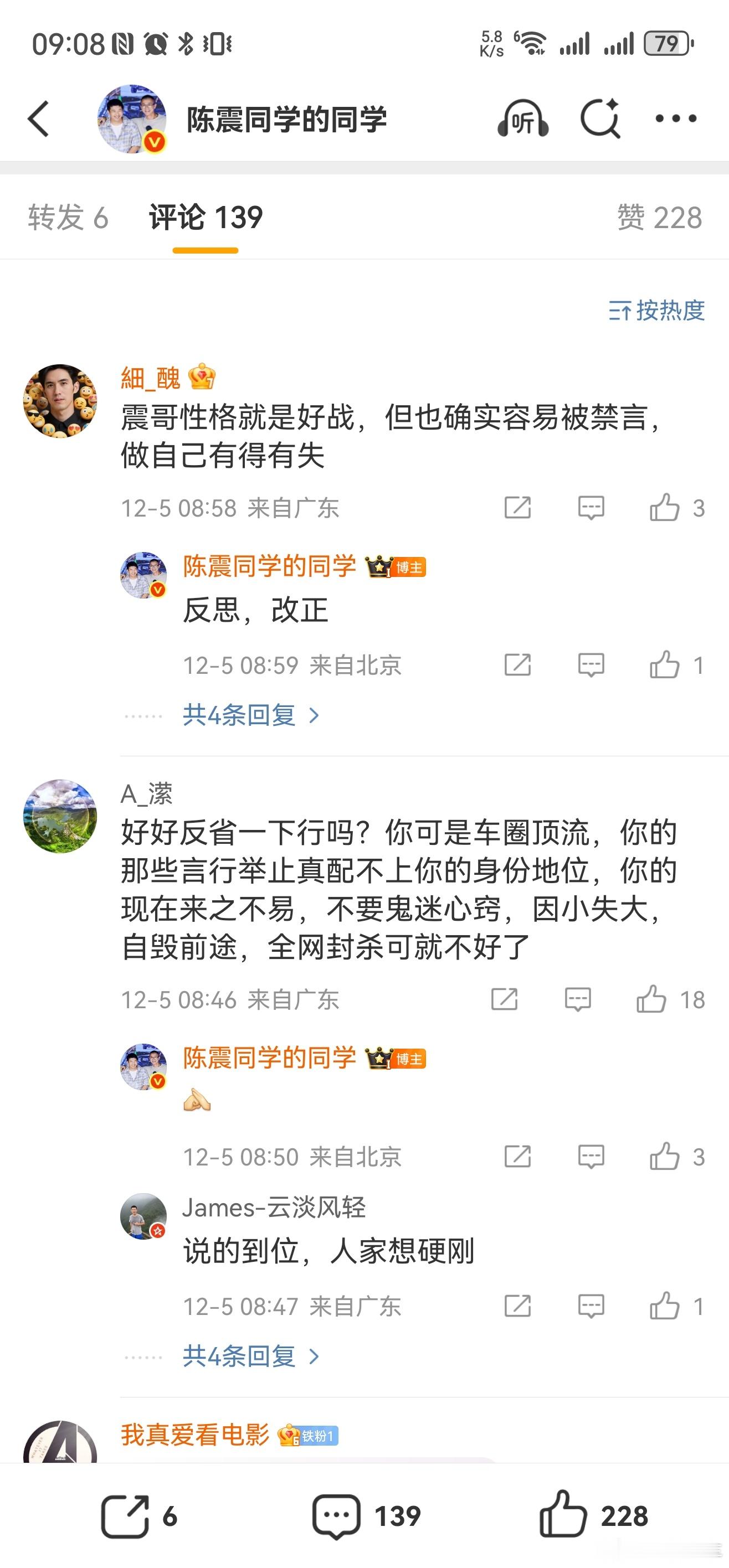 陈震多平台被禁言陈震同学的同学,当然也是陈震同学。陈震同学的同学表示:反思,改正
