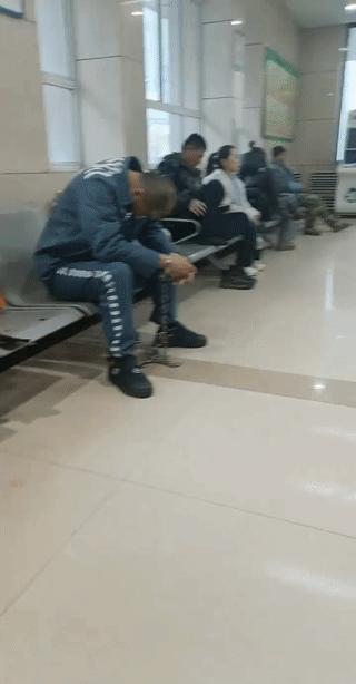 医院里看到一名戴着手铐脚镣的犯人正坐在椅子上等待做检查。 在他身边还有一名警察看护着他。 这个犯人也不知道他是怕遇到熟人? 还是因为身体不舒服太难受了? 他始终都是低着头坐着,不敢抬头看看?社会新闻 戴手铐