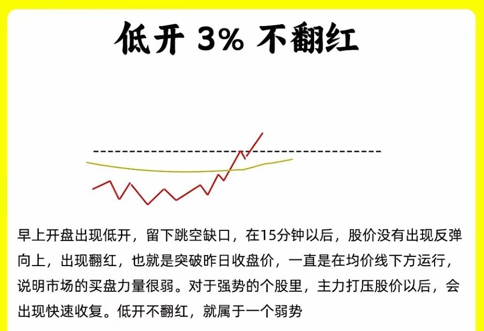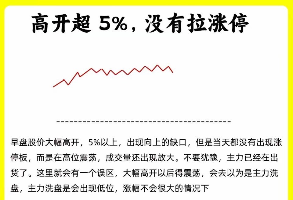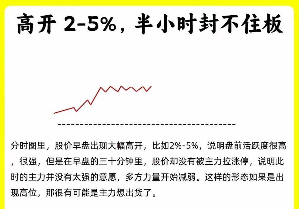 注意了!告诉大家一个颠覆认知的事情,很多短线高手,很注重早盘三十分钟的分时情况,个股是否强势,是走是留,通过早盘的三十分钟,就可以看的出来。而且,这黄金三十分钟是全天活跃度最高的时间段之一,波动最为激烈。今天我们就分享五种早盘半小时的形态,轻松发现主力在洗盘还是在出货。一、低开 3% 不翻红早上开盘出现低开,留下跳空缺口,在15分钟以后,股价没有出现反弹向上,出现翻红,也就是突破昨日收盘价,一直是在均价线下方运行,说明市场的买盘力量很弱。对于强势的个股里,主力打压股价以后,会出现快速收复。低开不翻红,就属于一个弱势二、 平开不跌,20 分钟拉升早上开盘以后,股价平开,随后股价开始横盘震荡,在早盘的三十分种里,股价出现拉升,这说明主力开始启动。早盘横盘其实是主力的一个蓄势表现,主力能早盘里出现拉升,说明主力很果断,主力盘整结束三、高开 2-5%,半小时封不住板在分时图里,股价早盘出现大幅高开,比如2%-5%,说明盘前活跃度很高,很强,但是在早盘的三十分钟里,股价却没有被主力拉涨停,说明此时的主力并没有太强的意愿,多方力量开始减弱。这样的形态如果是出现高位,那很有可能是主力想出货了。四、高开超 5%,没有拉涨停早盘股价大幅高开,5%以上,出现向上的缺口,但是当天都没有出现涨停板,而是在高位震荡,成交量还出现放大。不要犹豫,主力已经在出货了。这里就会有一个误区,大幅高开以后得震荡,会去以为是主力洗盘,主力洗盘是会出现低位,涨幅不会很大的情况下五、开盘秒板早上开盘以后,股价立马涨停,这一般是主力的抢筹,快速建仓,这个走势就比较强势。当然个股涨停以后,封单就显得很重要,如果主力真的很强势,当盘口买一就会大量的挂单,卖一几乎没有挂单,碾压式的对比。如果封单量少,那很有可能就会出现炸板回落好了!以上就是早盘三十分钟的五种常见形态,主力是否强势一目了然。希望对大家有启发和帮助,也是最为基础的内容,一定吃透。