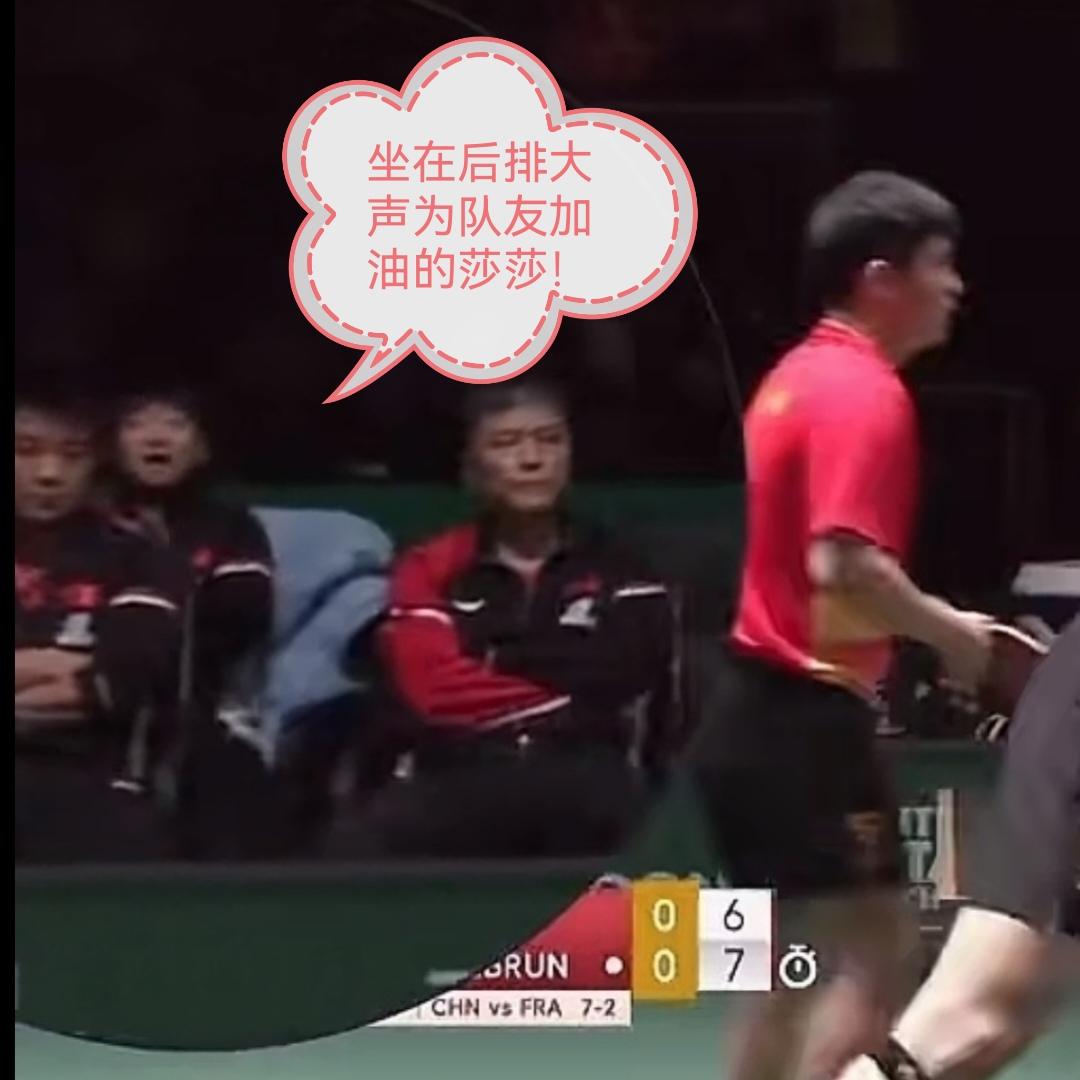 我们从来不是一个人在战斗,昨天晚上中国队对阵法国的的第四盘,王楚钦、林诗栋对阵法国勒布伦兄弟,打了混双的莎莎坐在替补席的第二排,实话实说不是中国队没想到要上第四盘,相信法国队也没有想到要打第四盘。 既然要打就全力以赴,一天两场大家都想着可以早点下班,虽然只差一分,但是团队一心,场上的队友就格外的充满力量,楚钦和石头在场上努力拿下最后一分,场下的每一位队友都在大声呐喊,为队友加油!透过声音,穿过前排的人群,看到了后排大声加油的莎莎同学,就是喜欢这么可爱的莎莎!
