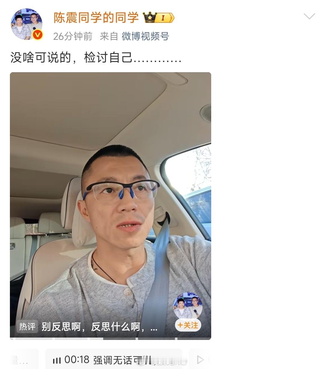 没想到陈震大号被禁言了,还有小号,表示:没啥可说的,检讨自己,然后网友热评:别反思啊!反思什么?