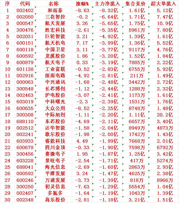 12月5日开盘45分钟,主力资金“卖出的 ”30名单! 和而泰:净流入 -8.32亿元 三花智控:净流入 -6.64亿元 航天发展:净流入 -5.65亿元 胜宏科技:净流入 -5.35亿元 巨轮智能:净流入 -4.92亿元