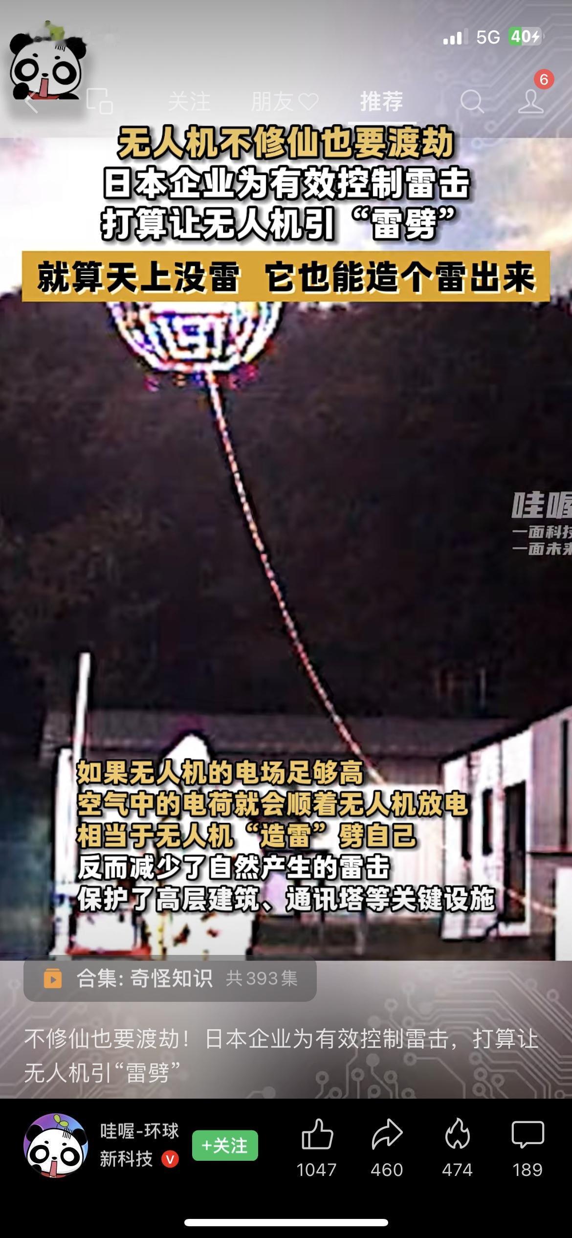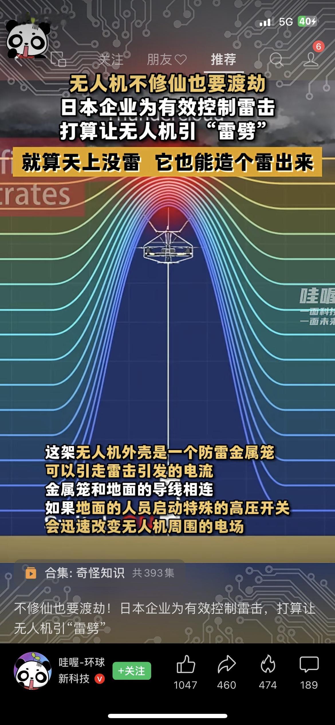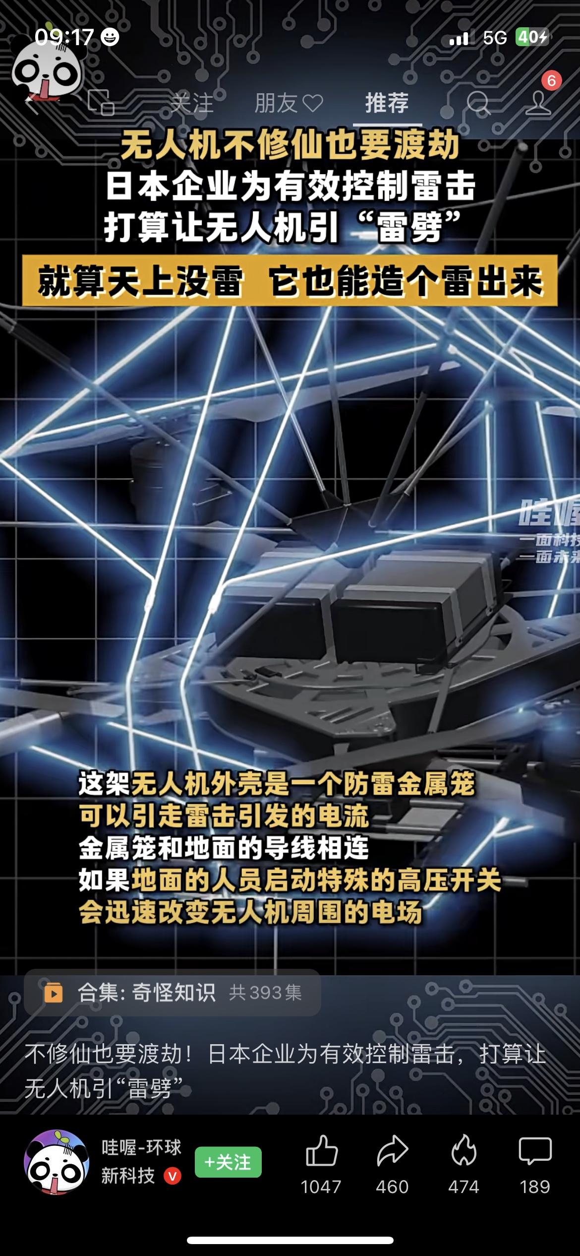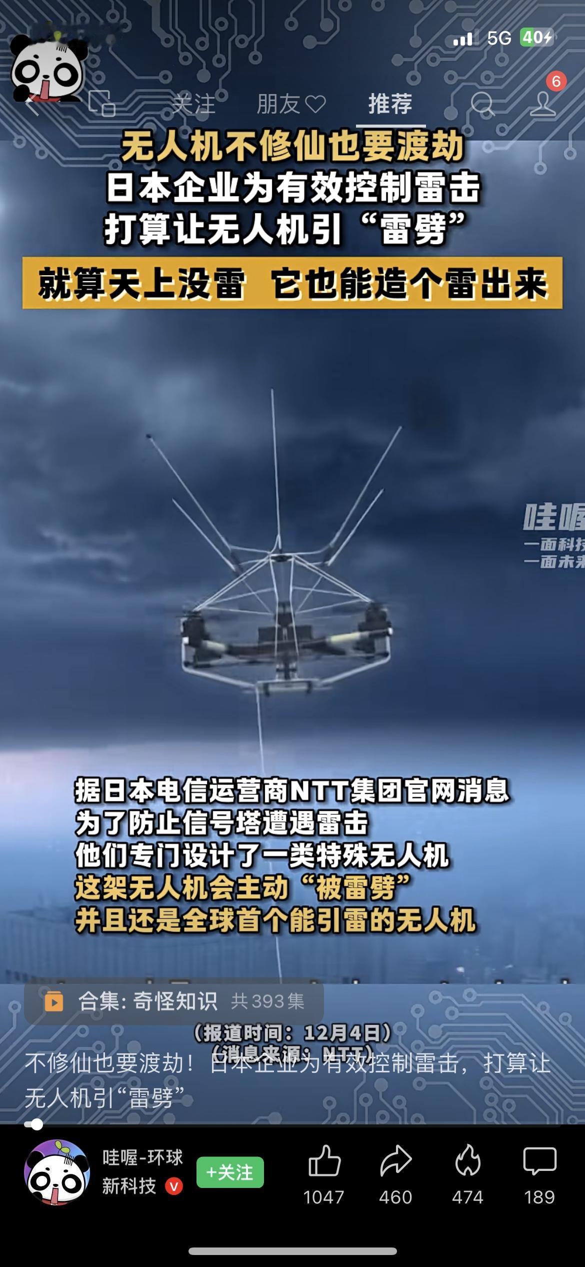 日本无人机竟能“引雷渡劫”?比避雷针牛,还能收集雷电发电? 最近日本搞出个黑科技,让网友直呼“科幻照进现实”——NTT公司研发的无人机,居然能主动触发闪电,还能引导雷电路径! 这无人机带了个特殊防护笼,能扛住150千安的电流(是自然闪电平均强度的5倍),12月4日实验在300米高空引雷成功,居然完好无损飞回来了。以前避雷针都是被动防护,这玩意儿直接主动“扛雷”,以后机场、风力发电场再也不怕雷击了。 更牛的是,研究团队还想把闪电能量存起来——一次闪电能释放10万千瓦时电,相当于1万户家庭1天的用电量,要是能收集成功,这不就是“天选清洁能源”?甚至未来还能给深空探测供能,NASA都盯上这技术了。 (信源:12月4日腾讯新闻《日本研发“引雷无人机”,成功触发闪电,未来或实现雷电发电》)无人机防雷 不过也有网友抬杠:“有这功夫不如多搞几个避雷针”“收集雷电靠谱吗?会不会炸了?” 你觉得这技术是黑科技还是多此一举?来聊聊~