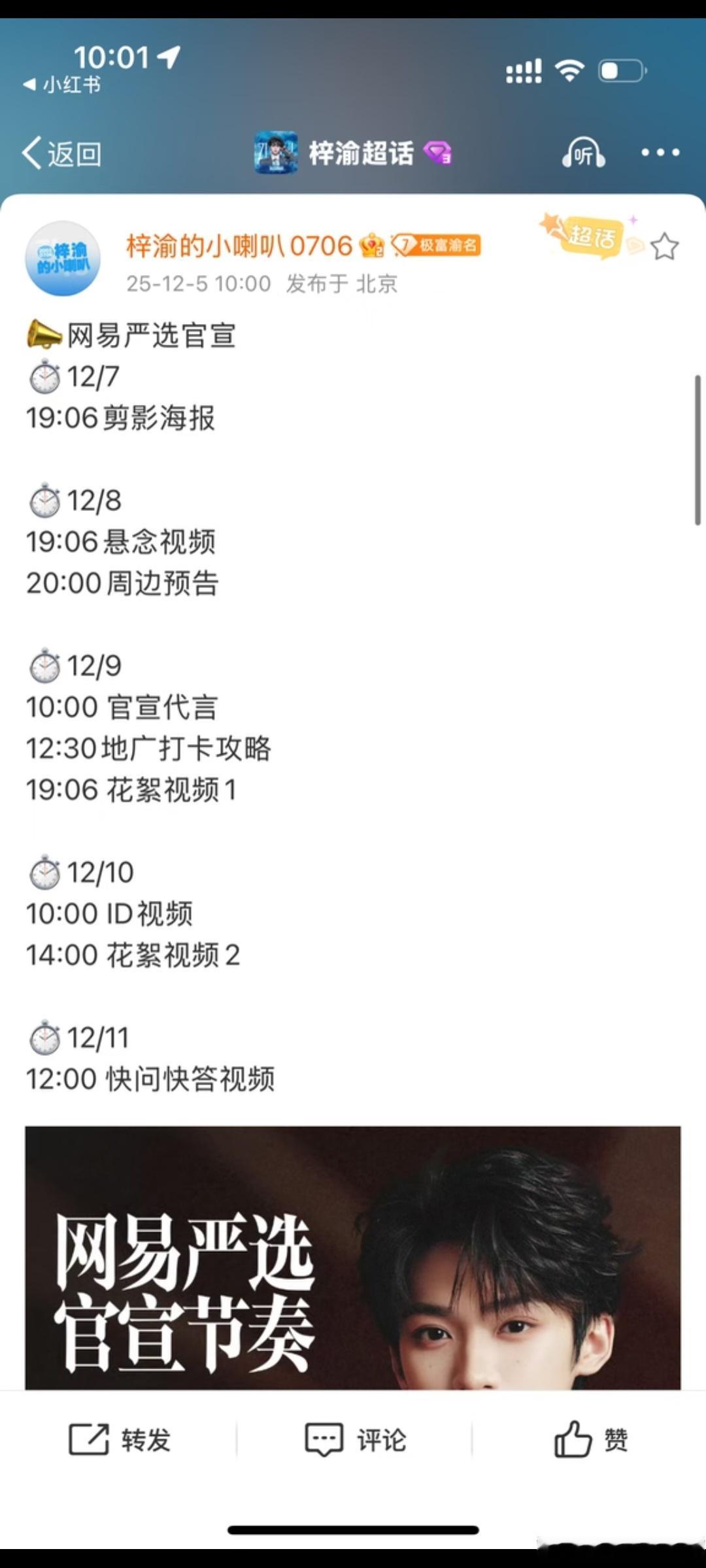 梓渝网易严选即将官宣!!!🔥商业价值的含金量还在上升,又一个平台代言来袭❗大家记得官宣后再下载❗⏱️12/719:06剪影海报⏱️12/819:06悬念视频20:00周边预告⏱️12/910:00 官宣代言12:30地广打卡攻略19:06 花絮视频1⏱️12/1010:00 ID视频14:00 花絮视频2⏱️12/1112:00 快问快答视频