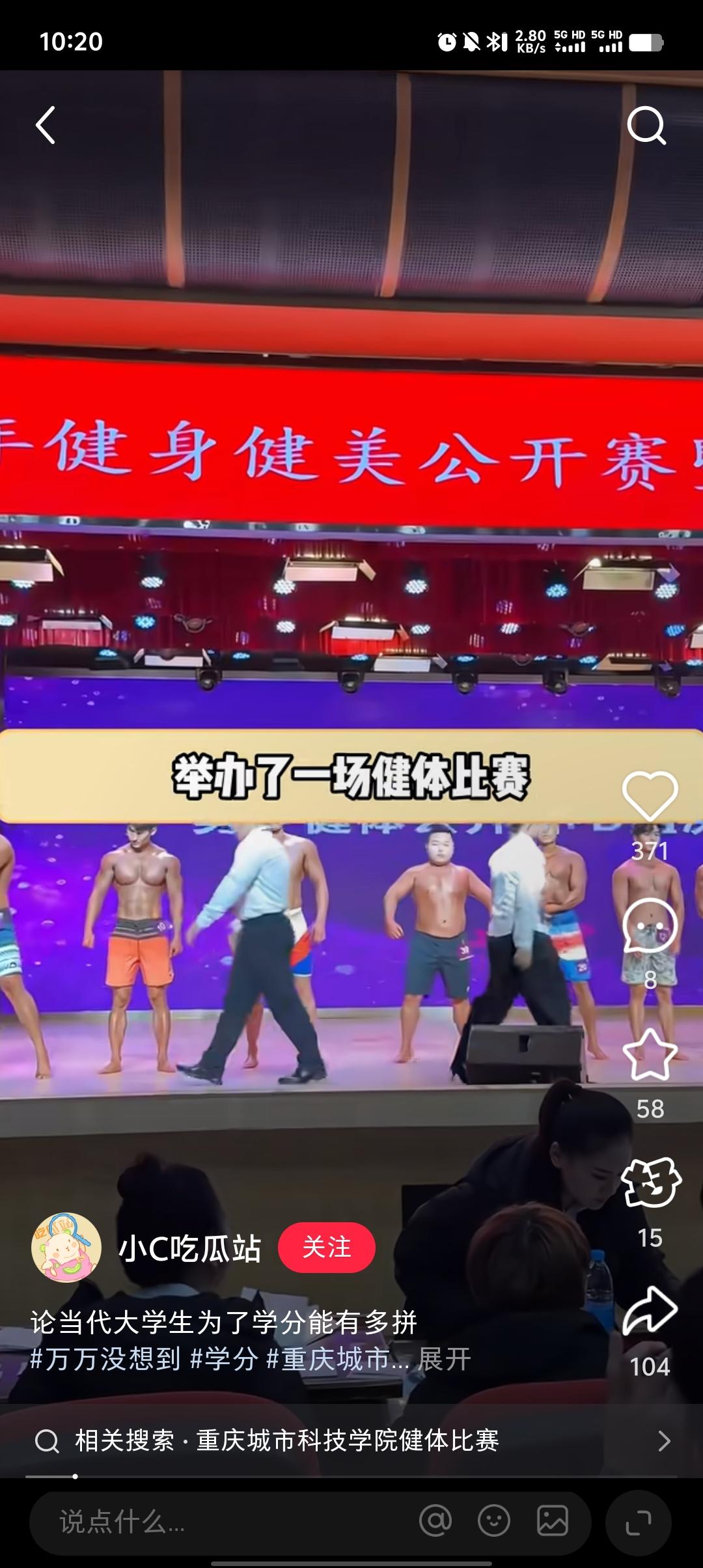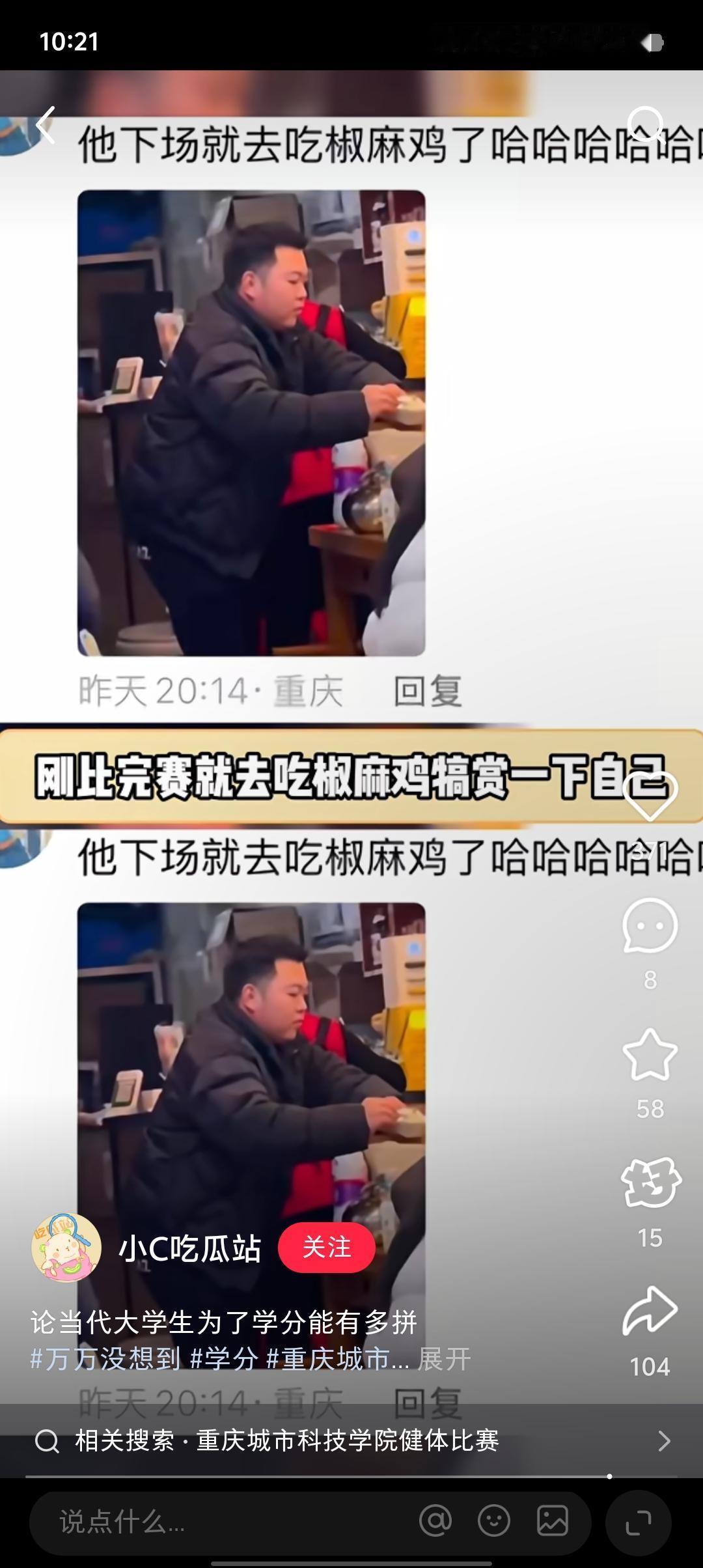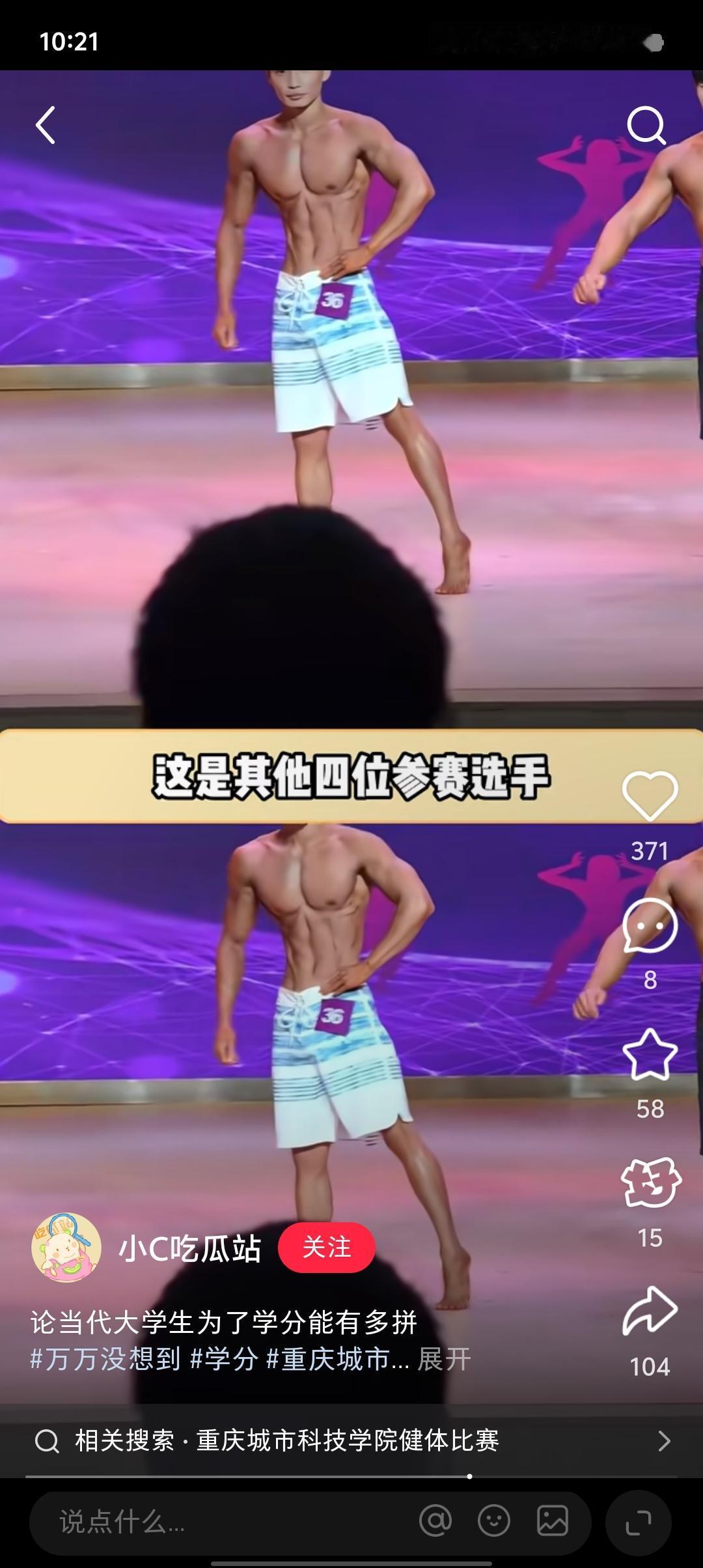 大学生为了学分有多拼,重庆城市科枝学院,举办了一场健体比赛。哥们涂好脆皮水就上了。连动作都是现学的。这是其他四位参赛选手。这是他,刚比完赛就去吃椒麻鸡犒劳一下自己。