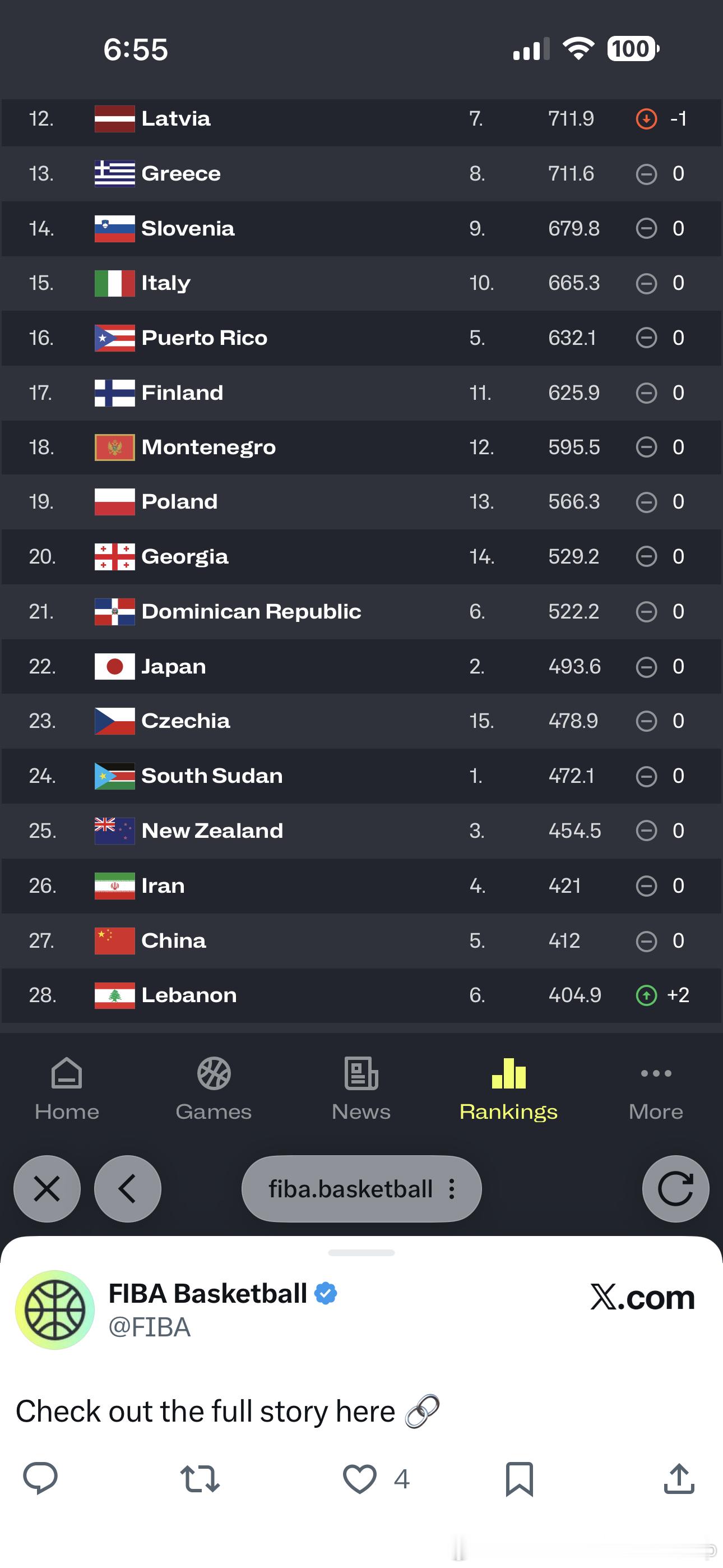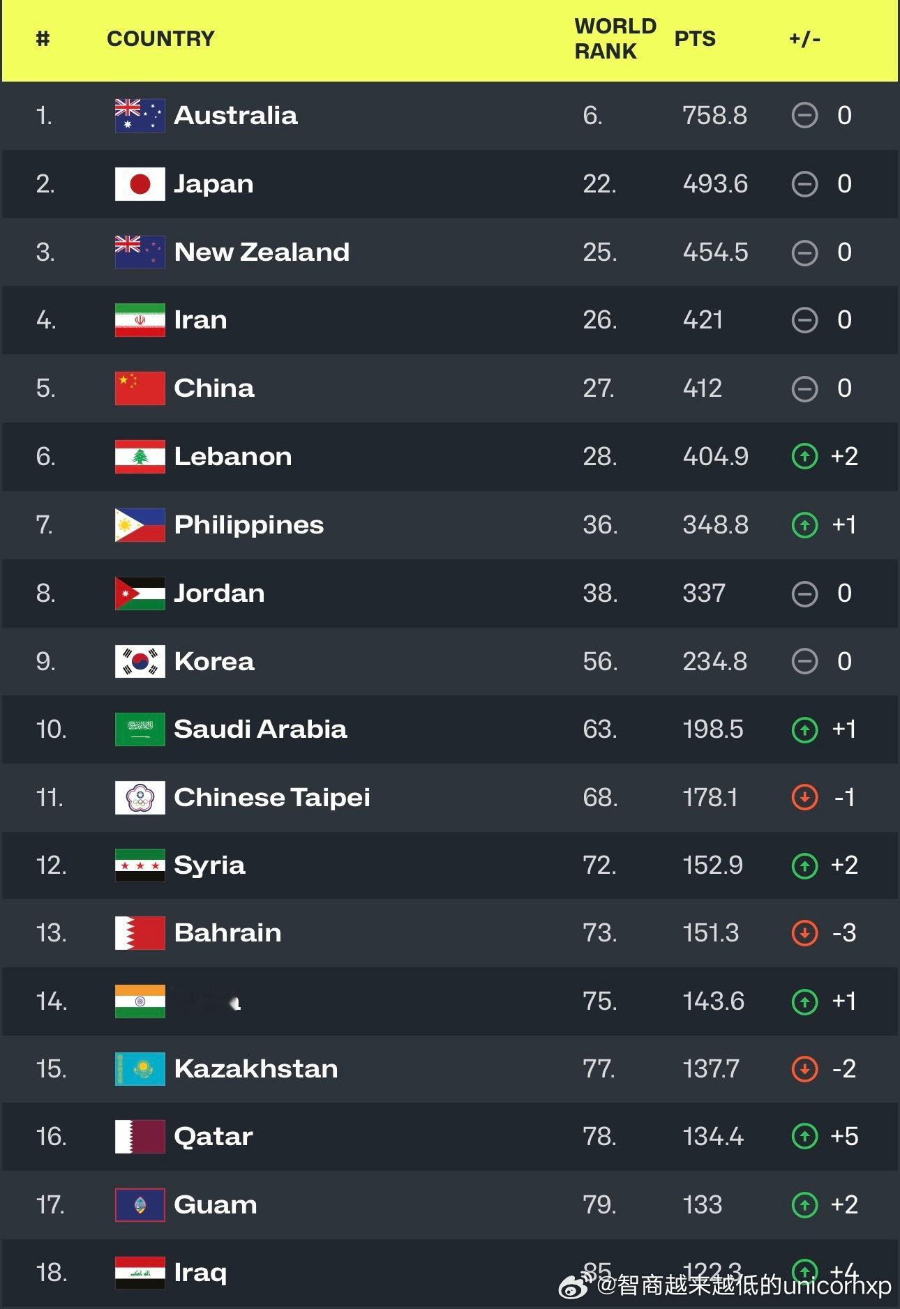 FIBA更新男篮世界排名,中国男篮世界排名和亚洲排名都没有发生变化。FIBA从世预赛窗口期开始启动了全新的积分体系,新体系中采用了积分累积制,只要打比赛就会有积分,输球也不会扣分,为鼓励球队赛事晋级,每一轮的权重系数不同,越打到后面奖励积分也会越多。因此预选赛第一窗口两场比赛的结果对积分影响有限。中国男篮亚洲篮球