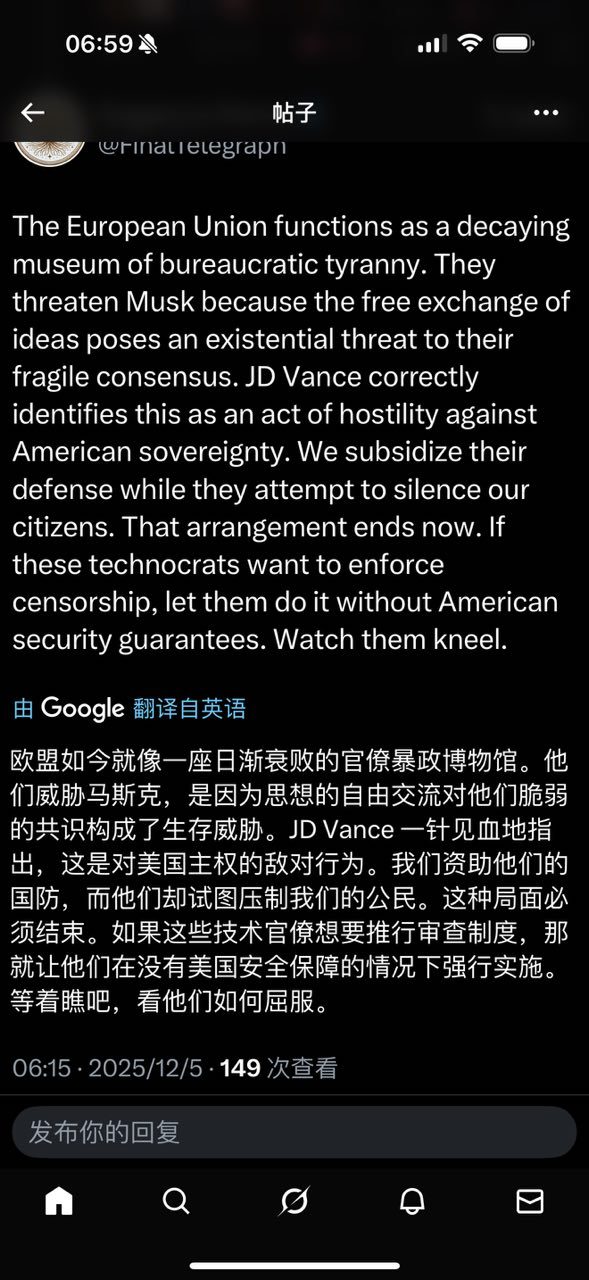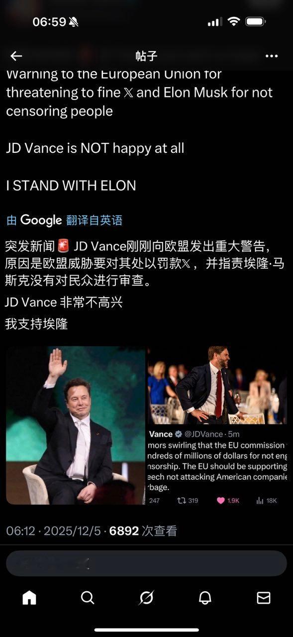 JD Vance刚刚向欧盟发出重大警告,原因是欧盟威胁要对X进行罚款,并指责埃隆.马斯克没有对民众进行审查。JD Vance非常不高兴