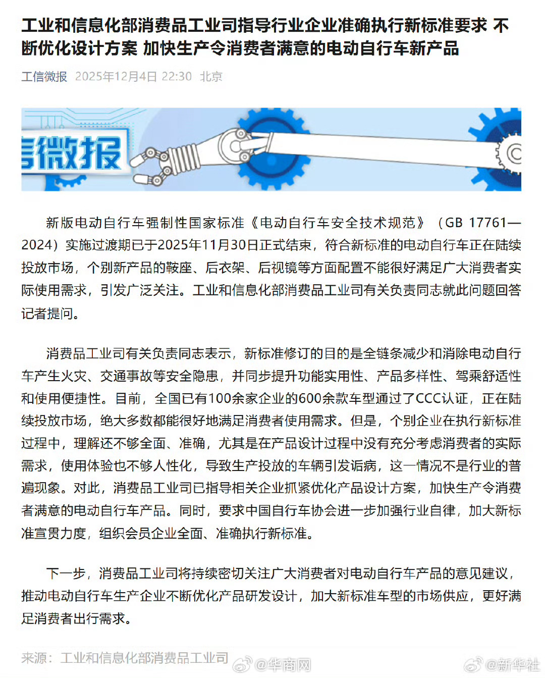 #工信部回应个别电动车不够人性化#【工业和信息化部消费品工业司指导行业企业准确执行新标准要求 不断优化设计方案 加快生产令消费者满意的电动自行车新产品】#加快生产消费者满意的电动车新产品# 新版电动自行车强制性国家标准《电动自行车安全技术规范》(GB 17761—2024)实施过渡期已于2025年11月30日正式结束,符合新标准的电动自行车正在陆续投放市场,个别新产品的鞍座、后衣架、后视镜等方面配置不能很好满足广大消费者实际使用需求,引发广泛关注。工业和信息化部消费品工业司有关负责同志就此问题回答记者提问。消费品工业司有关负责同志表示,新标准修订的目的是全链条减少和消除电动自行车产生火灾、交通事故等安全隐患,并同步提升功能实用性、产品多样性、驾乘舒适性和使用便捷性。目前,全国已有100余家企业的600余款车型通过了CCC认证,正在陆续投放市场,绝大多数都能很好地满足消费者使用需求。但是,个别企业在执行新标准过程中,理解还不够全面、准确,尤其是在产品设计过程中没有充分考虑消费者的实际需求,使用体验也不够人性化,导致生产投放的车辆引发诟病,这一情况不是行业的普遍现象。对此,消费品工业司已指导相关企业抓紧优化产品设计方案,加快生产令消费者满意的电动自行车产品。同时,要求中国自行车协会进一步加强行业自律,加大新标准宣贯力度,组织会员企业全面、准确执行新标准。下一步,消费品工业司将持续密切关注广大消费者对电动自行车产品的意见建议,推动电动自行车生产企业不断优化产品研发设计,加大新标准车型的市场供应,更好满足消费者出行需求。(来源:工业和信息化部消费品工业司)
