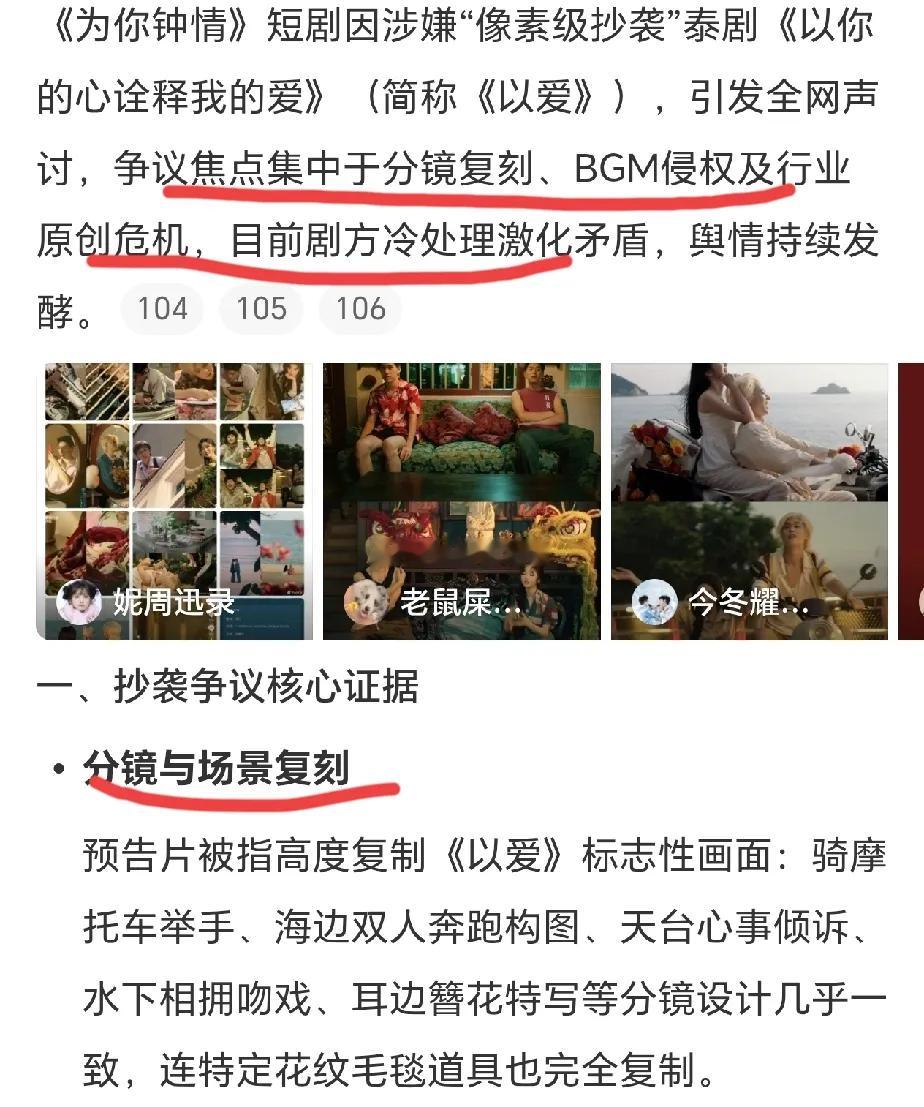 之前的短剧向来热衷于抄抄改改,不少长剧懒得计较,没想到这次终于踢到了铁板。先是有短剧因抄袭杨紫未播新剧《家业》被控诉,今天又一部短剧《为你钟情》被指抄袭泰剧《以你的心全是我的爱》,从剧情设定、拍摄手法到背景音乐,都被质疑存在雷同。别看是泰剧,这部剧的粉丝基数可不小,可不会像内娱一些长剧粉丝那样好说话,直接冲去《为你钟情》官博留言,要求剧方道歉甚至下架剧集,态度十分强硬。