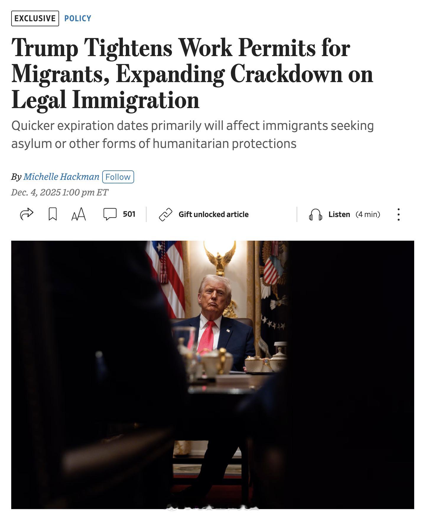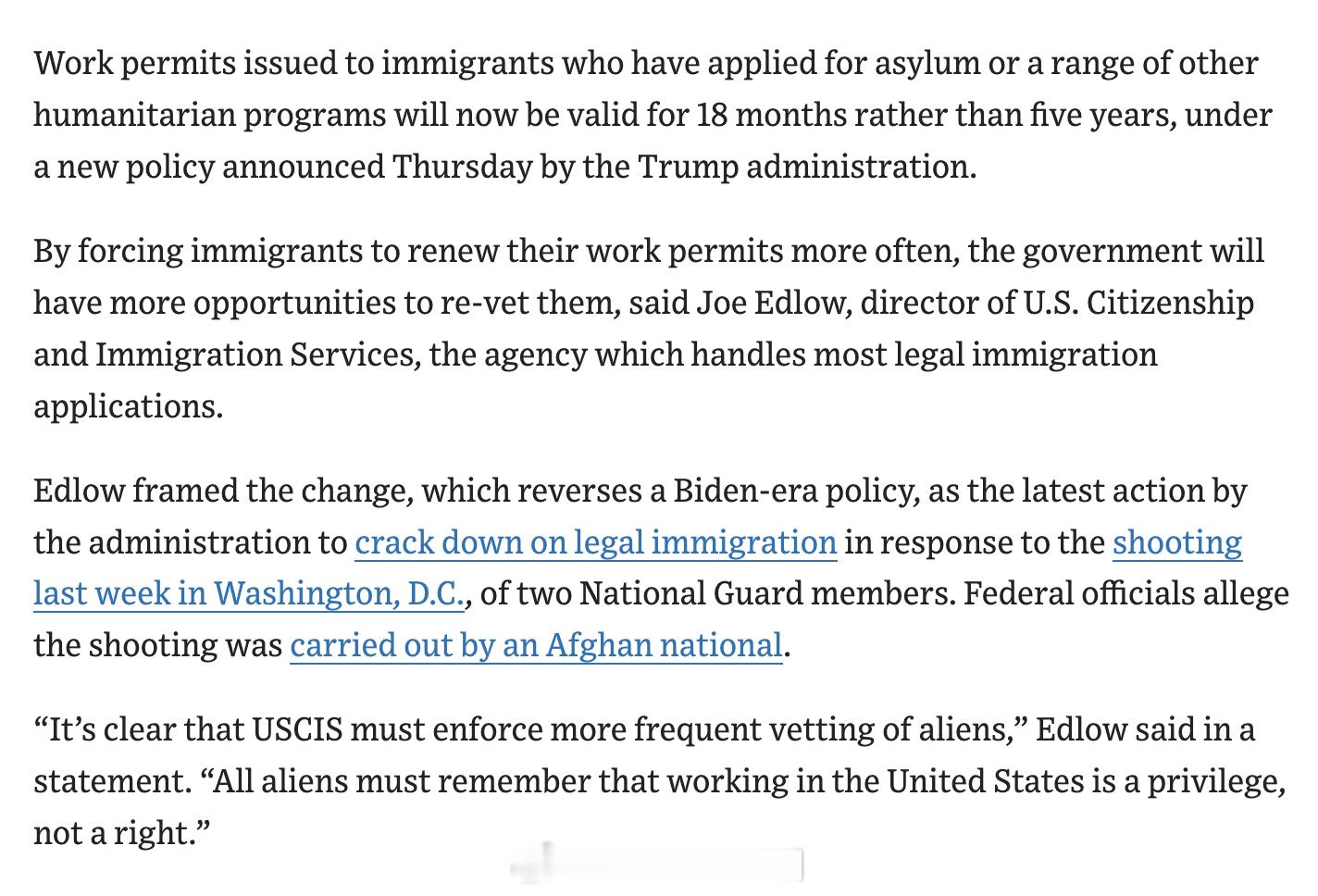 川普政府将庇护申请者及其他人道项目移民的工作许可有效期从五年缩短至 18 个月,目的是让政府能更频繁地重新审查移民背景。USCIS 局长 Joe Edlow 将此政策描述为对华盛顿国民警卫队员遇袭案的回应,并表示:“USCIS 必须对外国人进行更频繁的审查。所有外国人都必须记住,在美国工作是特权,不是权利。”今日焦点热点现场海外新鲜事