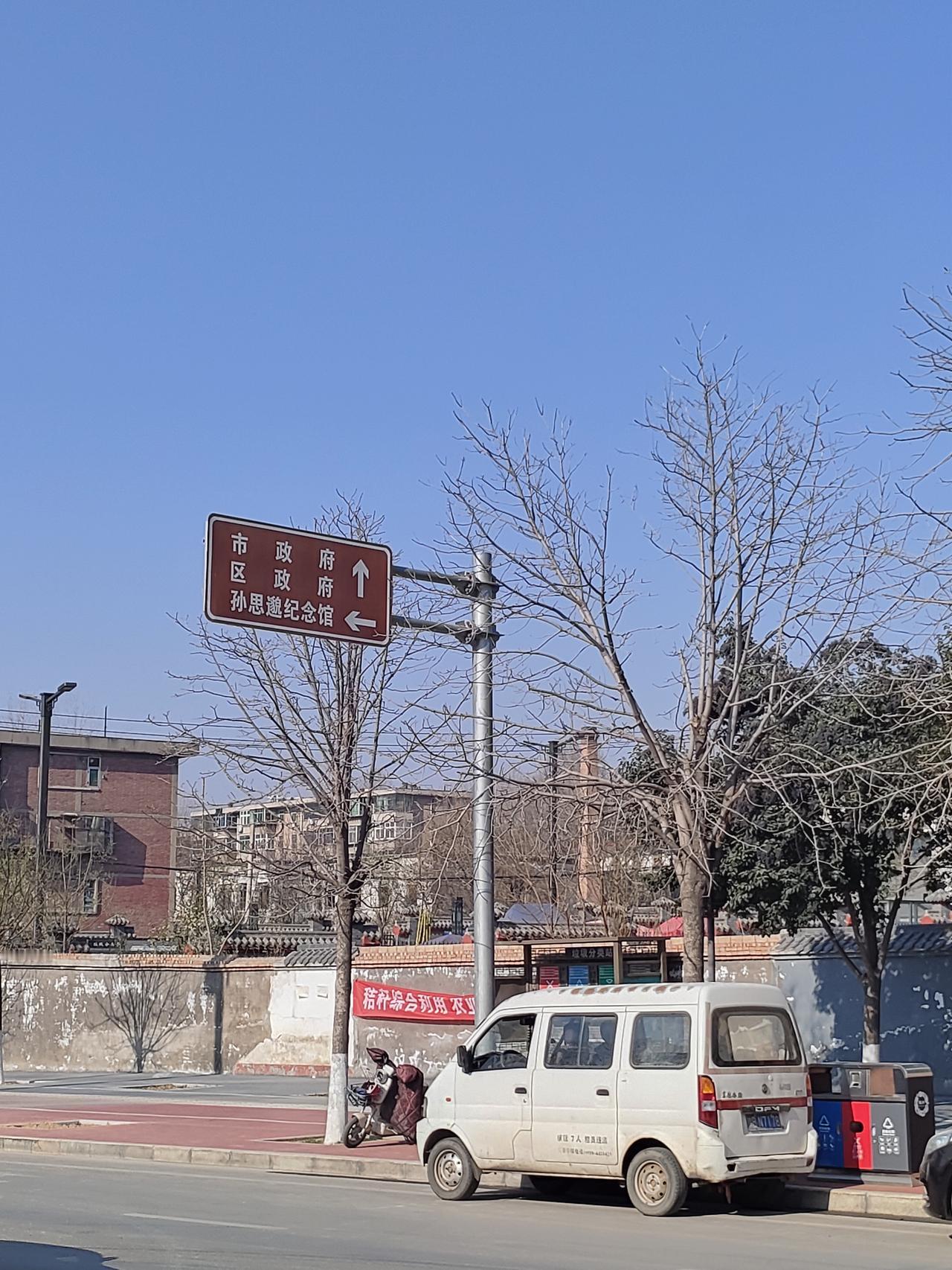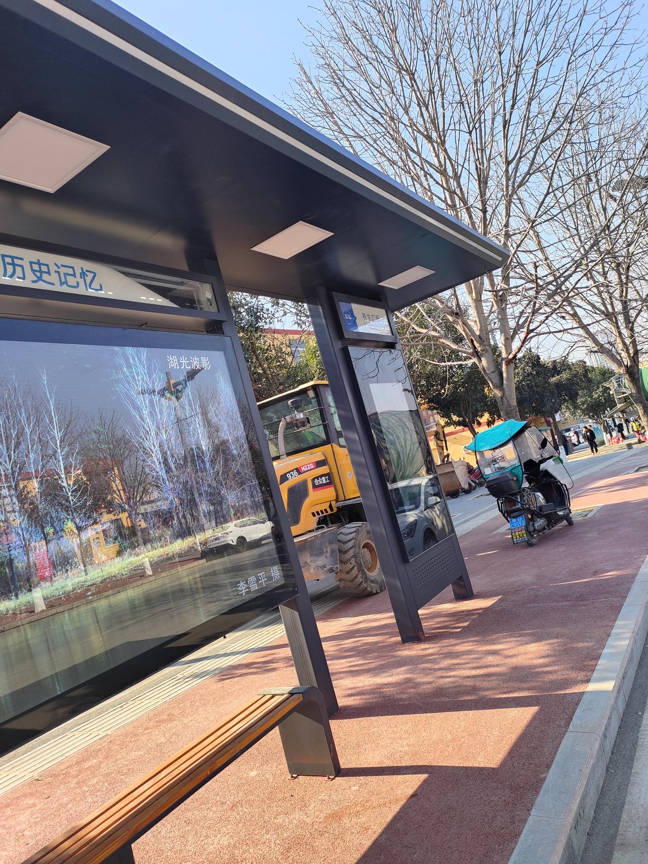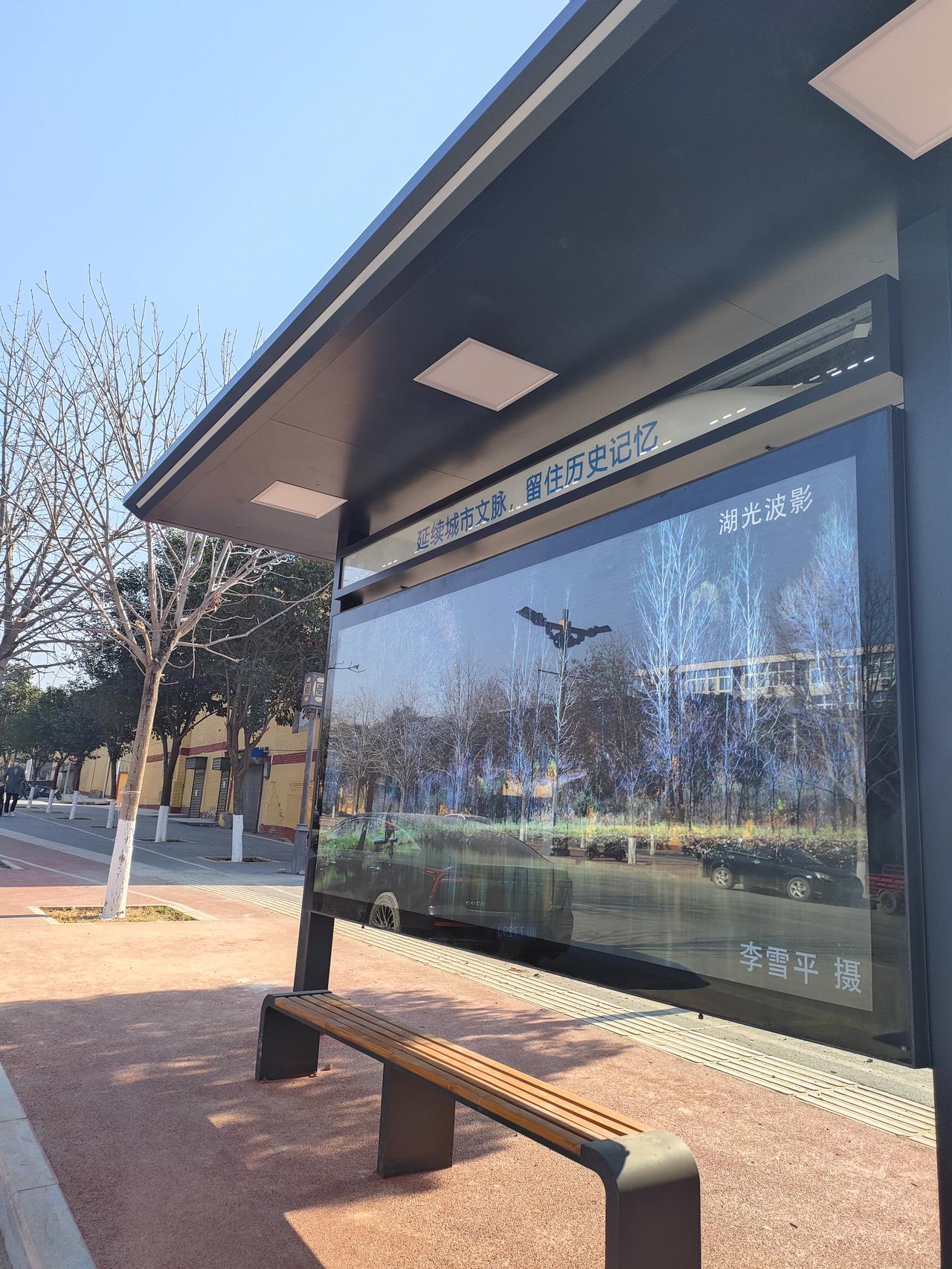 “蓝天把路牌衬得透亮,箭头明明白白分了方向:往前扎进市区烟火,左拐就能碰上千年前医圣的余温。落尽叶子的树桠支棱着,老楼墙皮裹着岁月的软,连停在路边的白面包都懒懒散散,把这冬日的晴天抻得更长了。” 公交站的玻璃屏里,“湖光波影”浸着冬树的清寒,外头的挖机与三轮却裹着烟火气。日光把树桠的影子织在红步道上,连等候的长椅都晒得暖融融——旧忆与日常,就这么在晴天里轻轻叠在了一起。