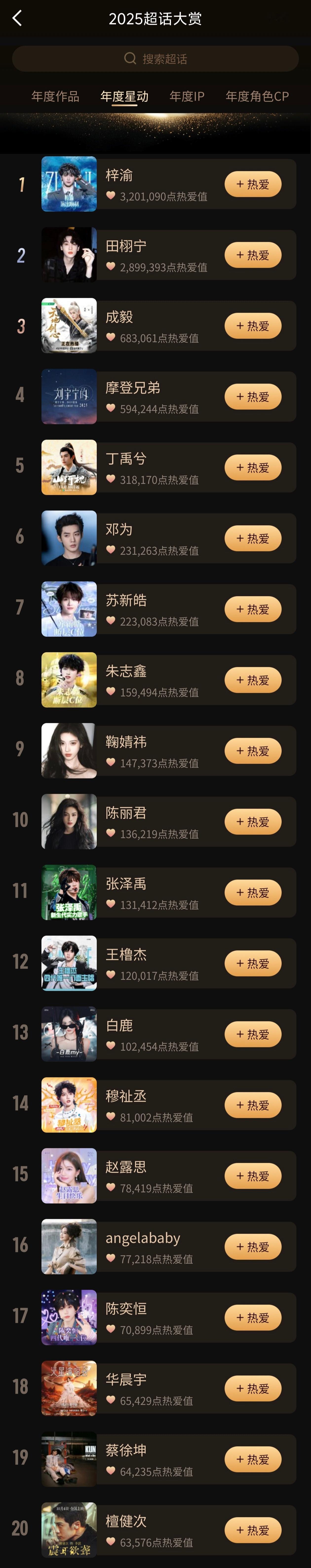 2025超话大赏年度星动TOP20:梓渝〡田栩宁〡成毅〡刘宇宁〡丁禹兮〡邓为〡苏新皓〡朱志鑫〡鞠婧祎〡陈丽君〡张泽禹〡王橹杰〡白鹿〡穆祉丞〡赵露思〡Angelababy〡陈奕恒〡华晨宇〡蔡徐坤〡檀健次